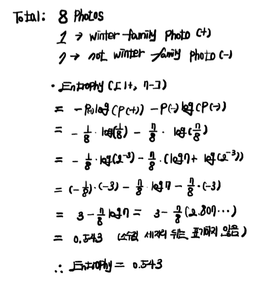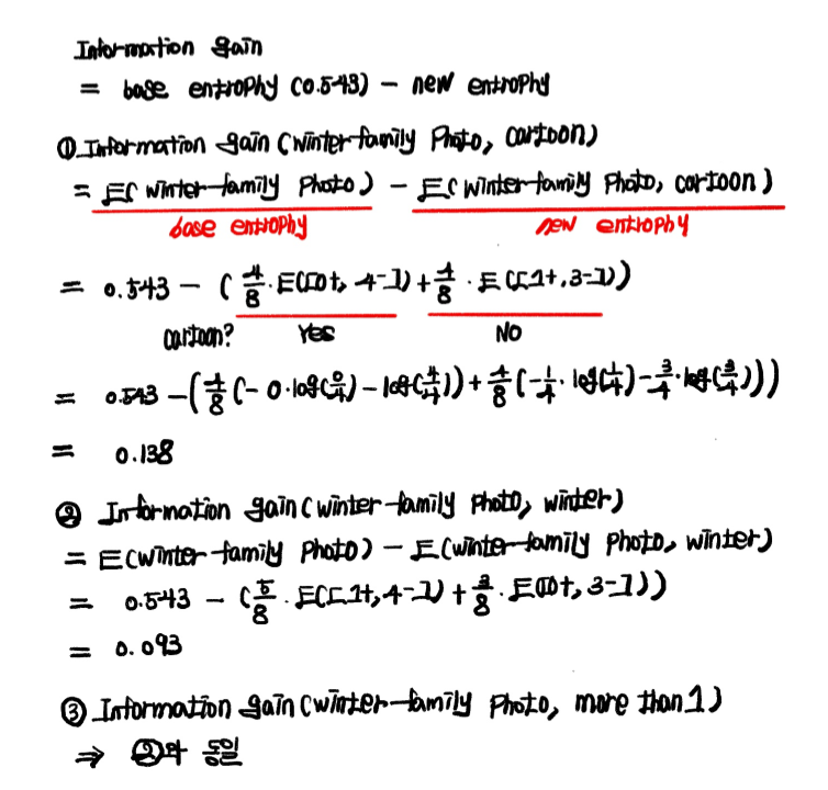 new entrophy를 구하는 과정에서 엔트로피 앞부분에 해당 속성이 선택될 확률(1번에서, E(winter family photo, cartoon)을 구하는 과정에서 E([0+, 4-]) 앞의 p(4/8)를 의미합니다)을 곱하는 부분에 유의하며 이해하면, 쉽게 이해할 수 있을 것입니다. 물론 우리는 직관적으로 "Cartoon Character?" 속성을 먼저 선택하는 것이 유리하다고 판단할 수 있지만, 컴퓨터는 엔트로피 계산 과정을 통해 information gain을 구하는 과정을 거쳐 information gain이 가장 높은 속성인 "Cartoon Character?"를 선택합니다.
