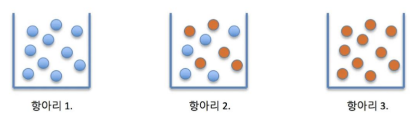 이제 보다 효율적인 Decision Tree를 위해서는 어떻게 해야 할까요? 먼저 불순도(impurity)와 엔트로피(entrophy)에 대해 이해하고 넘어가겠습니다. 우선 불순도는 한 범주 내 다른 범주의 개체들이 얼마나 포함되어 있는지에 대한 지표입니다. 반대되는 개념으로는 순도(purity)가 있으며, 아래의 그림을 보면 항아리 1과 3에는 파란색 공과 빨간색 공들만 들어 있으나, 항아리 2에는 파란색 공들과 빨간색 공들이 섞여 있는 모습을 볼 수 있습니다. 항아리 1과 3은 불순도 0%, 순도 100%이며 항아리 2는 불순도가 높고 순도가 낮은 상태라고 말할 수 있습니다.