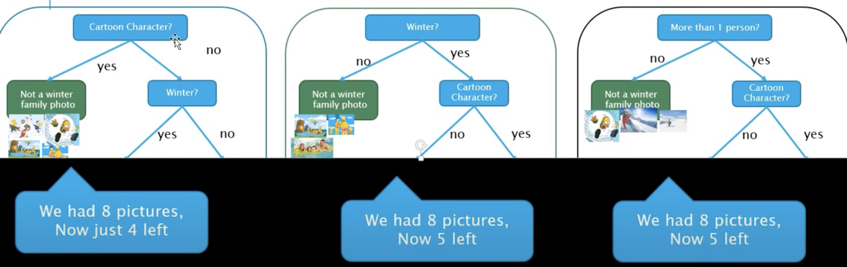 처음 8장의 사진에서, 분류에 어떤 속성을 사용하느냐에 따라 분류되는 사진의 수가 달라지는 것을 확인할 수 있습니다. 예를 들어 위의 왼쪽 사진에서처럼 "Cartoon Character?" 속성이 분류 기준으로 사용된다면 Yes / No 분류기를 거쳐 남는 사진은 4개입니다. 반면 중간과 오른쪽 사진에서처럼 "Winter?"과 "More than 1?" 속성이 분류 기준으로 사용된다면 분류기를 거쳐 남는 사진은 5개가 됩니다. 물론 "최종적으로 남는 데이터는 어차피 하나이므로 큰 차이가 없지 않나요?" 하는 의문점이 들 수 있지만, 실제 모델을 만들어 학습 시에는 데이터의 양이 방대하므로 분류기를 거쳐가며 남는 데이터의 개수가 가장 작아지는 속성을 사용하는 것이, 다른 말로 엔트로피가 가장 작아지는 속성을 사용하는 것이 효율적인 알고리즘이라고 할 수 있습니다. 또한 ID3에는 information gain(정보 획득)의 개념을 알아두어야 하는데, information gain은 base entrophy에서 new entrophy을 뺀 것을 의미합니다. 예를 들어 위 사진의 왼쪽에서 분류 이전 사진의 개수(base entrophy)는 8개이며, 속성 "Cartoon Character?"로 분류한 뒤 남은 사진의 개수(new entrophy)는 4개로, 정보 획득은(had 8 pictures - now just 4 left, 8-4) 4입니다. 결과적으로 entrophy는 적은 방향으로, information gain은 큰 방향으로 속성을 선택하는 것이 중요하다고 할 수 있습니다. 이해를 돕기 위해 사진의 개수로 엔트로피를 설명했지만, 실제 엔트로피는 공식에 의해 수치적으로 계산되며, 엔트로피를 통해 information gain을 계산한 다음 최적의 속성을 선택하여 알고리즘을 구성하게 됩니다. 이제부터 처음 상태의 엔트로피와 첫 번째 단계를 거친 다음의 엔트로피 계산을 통해 information gain을 얻은 다음, 어떤 속성이 information gain이 가장 높은지(다른 말로 가장 효율적인 첫 번째 분류 속성을 찾는 과정입니다) 알아보겠습니다.