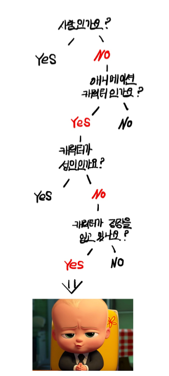 전 포스트에서 kNN 알고리즘을 설명하며 유유상종이라는 사자성어를 예로 들어 설명했는데, 이번에는 Decision Tree를 쉽게 이해하기 위해 스무고개를 예로 들어보겠습니다. 우리는 스무고개를 할 때 예 / 아니오에 해당하는 질문을 통해 후보군을 좁혀 나갑니다. 아래의 그림처럼 정답이 "보스 베이비"라고 할 때 먼저 첫 번째 질문으로 "사람인가요?"를 했다면, "아니오"라는 답변을 통해 후보군을 사람이 아닌 분류로 좁혀나갈 수 있습니다. 다음 질문으로 "애니메이션에 나오는 캐릭터인가요?"에 대해서는 "예", 그다음 질문으로 "캐릭터가 성인인가요?"에 "아니오"라는 답변을 받았다면, 정답이 될 수 있는 후보를 굉장히 많이 좁힐 수 있습니다. 마지막으로 "캐릭터가 정장을 입고 있나요?"라는 질문을 한다면, "예"라는 대답과 함께 우리는 정답이 보스 베이비임을 맞출 수 있습니다. 이렇듯 스무고개와 동일한 방식으로 어떤 특징(Feature)이나 속성(Attribute)을 통해 나무 구조로 나타내며 데이터를 분류하는 방식이 Decision Tree(결정 트리) 알고리즘입니다.