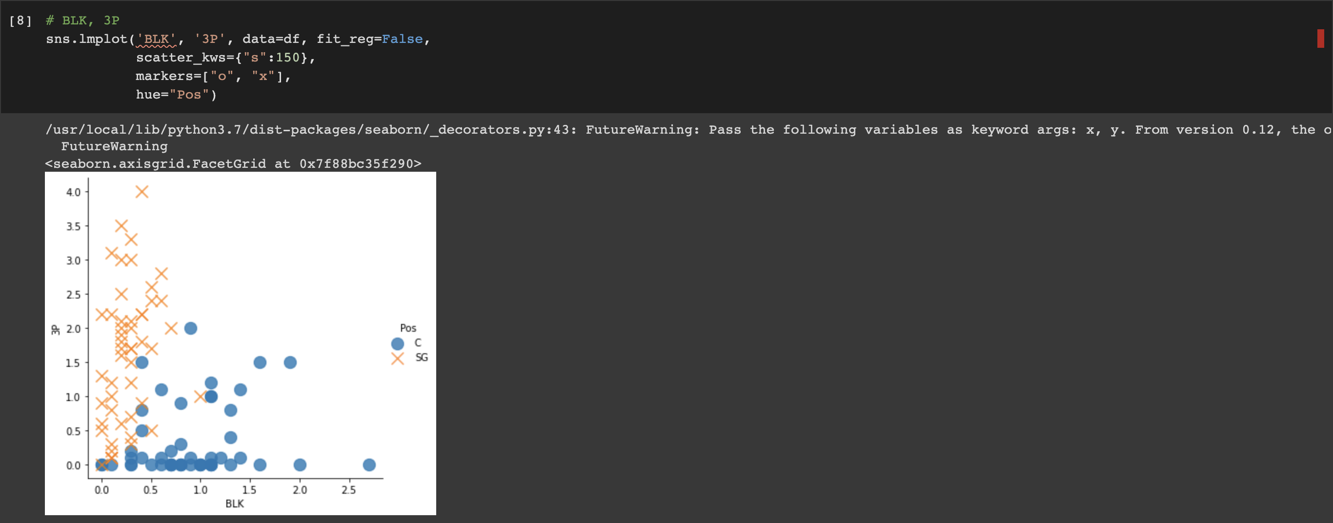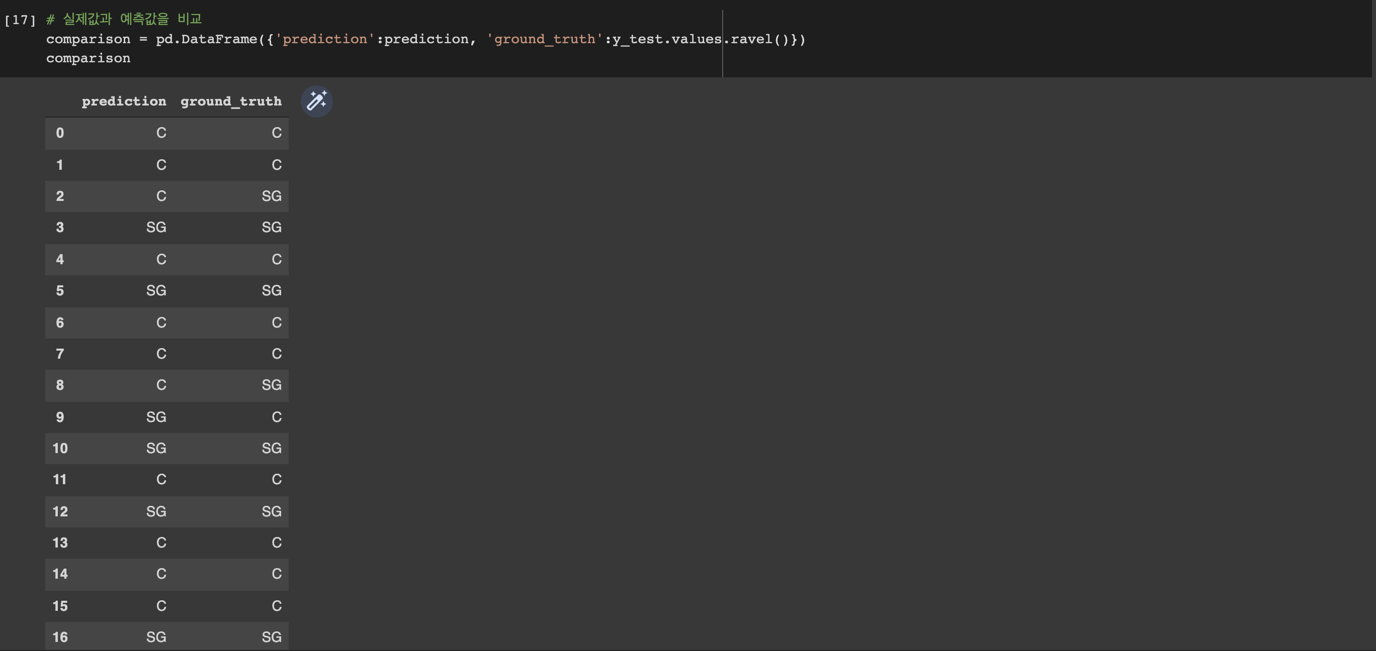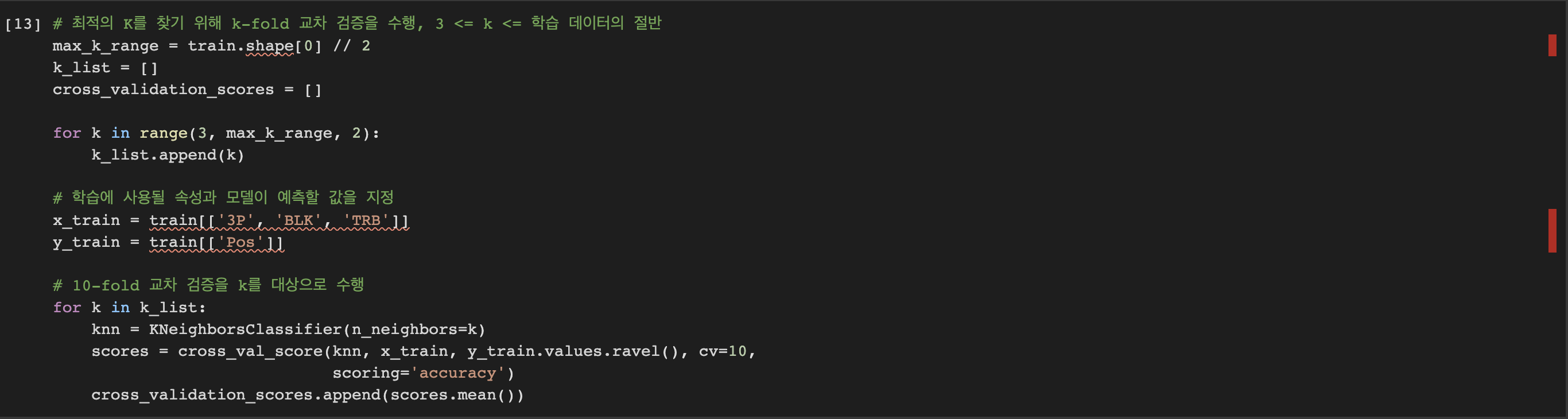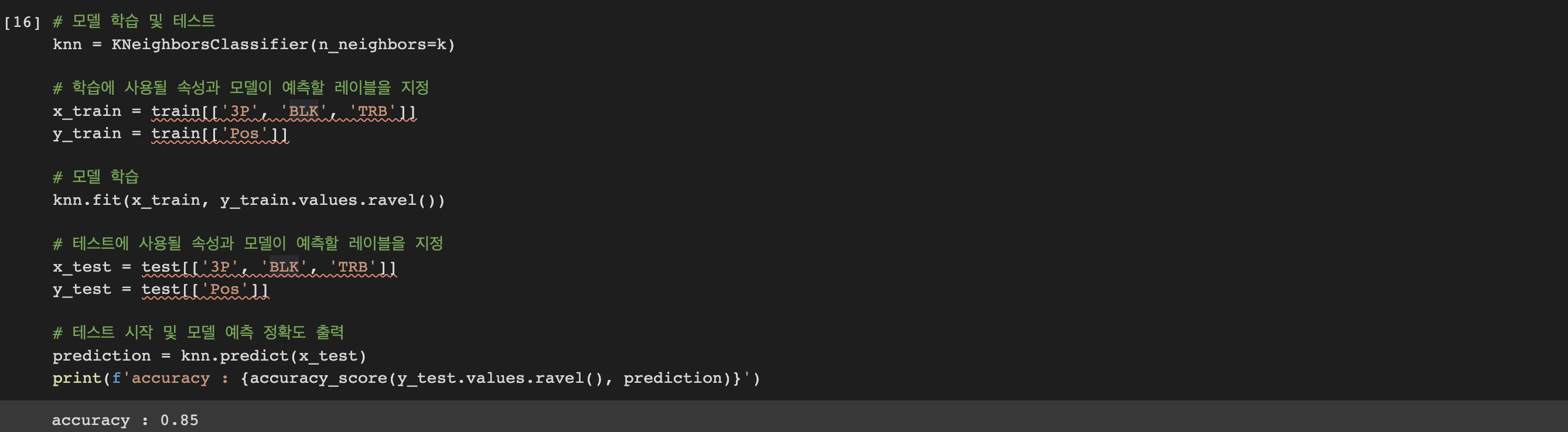 sklearn에 구현되어 있는 kNeighborsClassifier()의 n_neighbors를 미리 찾은 최적의 k값을 넣은 다음 3P, BLK, TRB 속성과 Pos 레이블로 모델을 학습하여 테스트한 다음 정확도를 출력하니 0.85(85%)의 정확도를 보입니다. 테스트 데이터 선수의 3P, BLK, TRB 값을 토대로 포지션을 예측한 결과와 실제 포지션을 비교해본 결과가 100개 중 85개 수준으로 일치했다는 것은 모델 생성에 힘들지 않았음에도 유의미하고 괜찮은 정확도를 보였다고 볼 수 있습니다. 실제로 예측값과 실제값을 비교한 데이터 프레임을 확인해보면 20명 중 3명의 포지션 예측만 틀렸음을 알 수 있습니다. 모든 센터 포지션 선수들이 3점슛에 약하거나 모든 슈팅가드 포지션 선수들이 리바운드가 적은 것은 아닐 것이므로, 실제로 kNN 알고리즘 모델은 훨씬 더 좋은 평가를 받을 수 있을 것입니다.