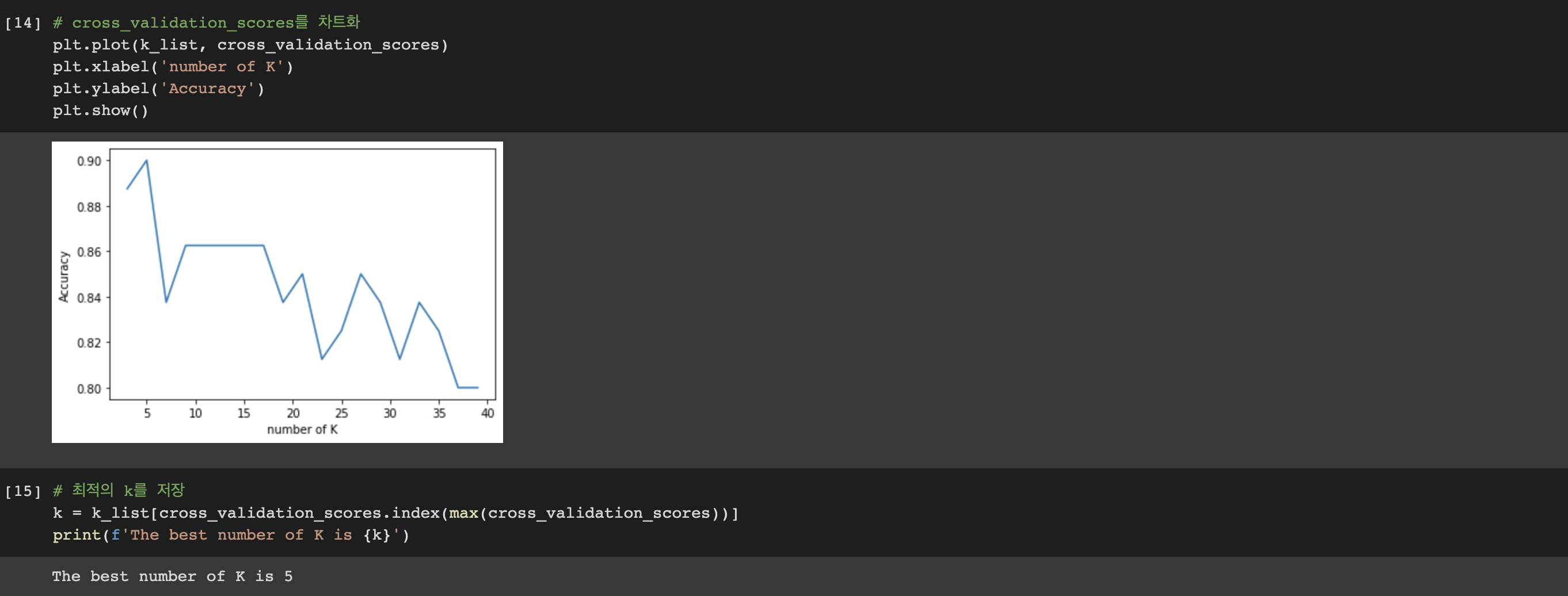 그래프를 그려 확인해보니 k = 5일 때 검증 정확도가 가장 높은 것을 알 수 있습니다. 이제 최적의 k를 찾은 다음, 모델을 학습하고 미리 분리해둔 테스트 데이터로 모델을 검증하는 일만 남았습니다. 미리 짚고 넘어가자면 학습 데이터와 테스트 데이터는 무작위로 분리되기 때문에 실행마다 최적의 k 값이 달라질 수 있습니다.