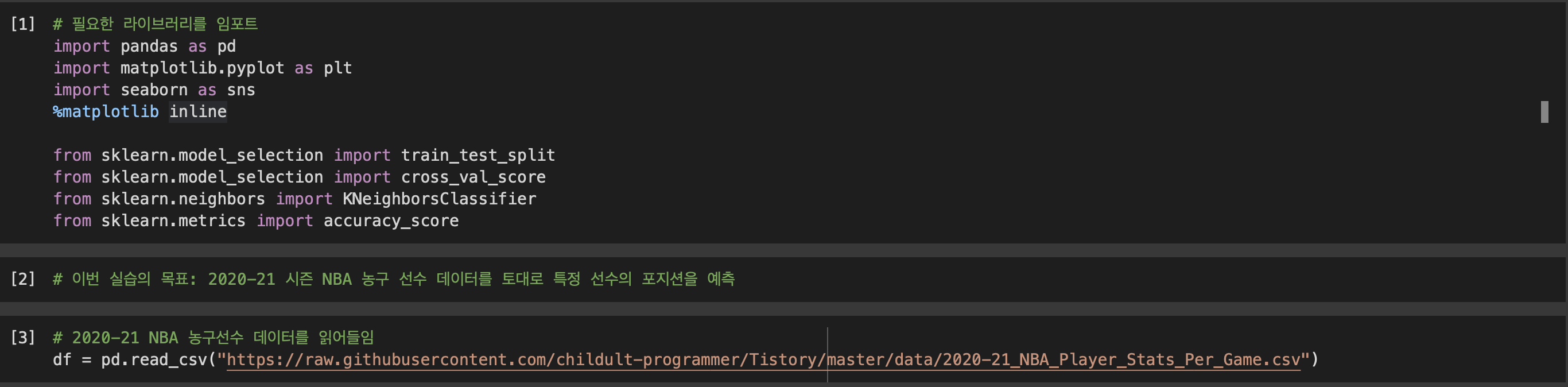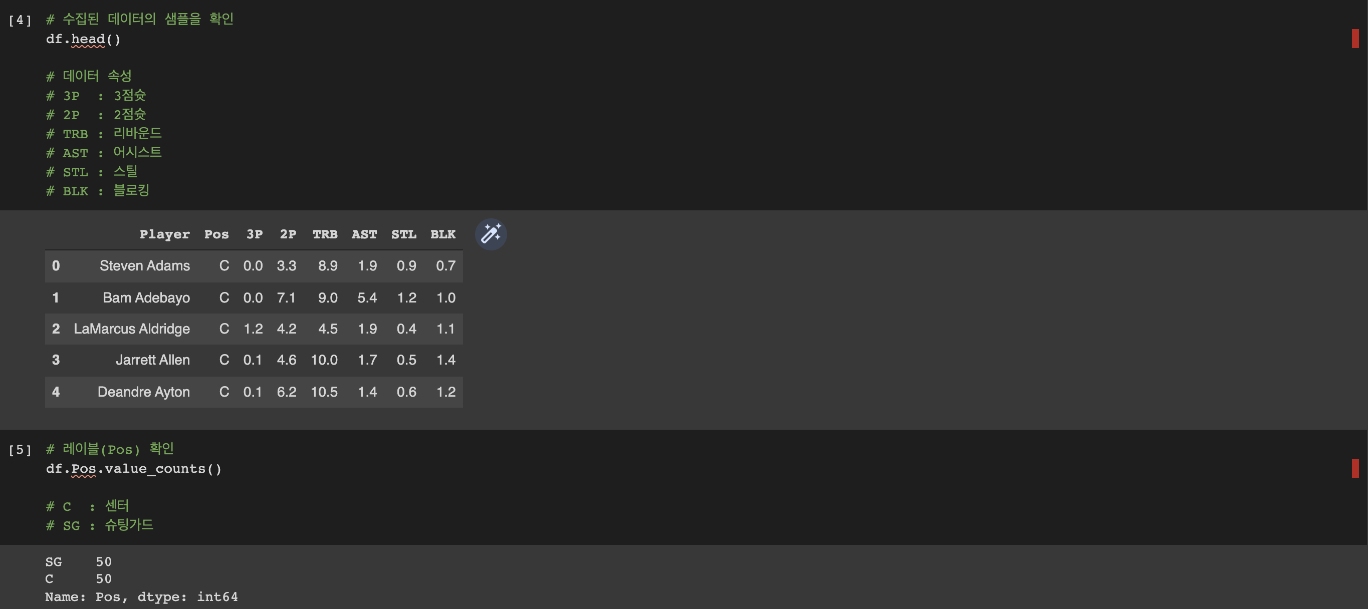 이전 포스트에서는 2020-21 시즌 NBA 농구 선수의 실제 데이터를 담은 사이트에서 크롤링하여 판다스의 데이터 프레임의 형식으로 가공한 다음, csv 파일을 생성해봤습니다. 이번에는 데이터 시각화 및 분석 이후 kNN 모델을 생성한 다음 예측 및 평가를 진행해보겠습니다. 실습 환경은 Google Colab에서 진행하였으며, 실습 코드 및 데이터는 위 링크의 Github에서 받아볼 수 있습니다.