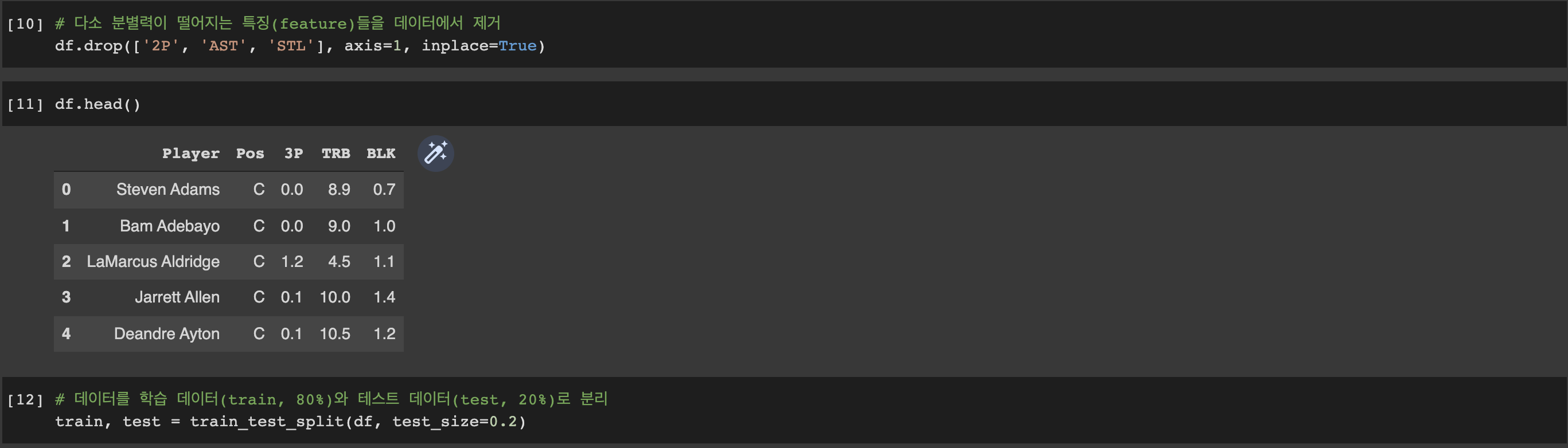 그렇다면 분별력이 떨어져 학습에 불필요한 속성인 2점슛과 어시스트, 스틸을 데이터 프레임에서 삭제한 다음, 다시 데이터 프레임을 확인해보면, 이제 우리는 3점 슛, 리바운드, 블로킹의 속성으로 모델을 학습할 것임을 알 수 있습니다. 그다음 학습 데이터와 테스트 데이터를 8:2의 비율로 분리하겠습니다. 데이터를 분리하는 작업도 이미 sklearn 내 train_test_split()의 함수로 구현되어 있습니다. 테스트 데이터 사이즈를 결정짓는 test_size를 0.2로 설정한 다음 실행하면, train에는 전체 데이터의 80%, test에는 전체 데이터의 20%로 분리되어 저장되어 있음을 알 수 있습니다.