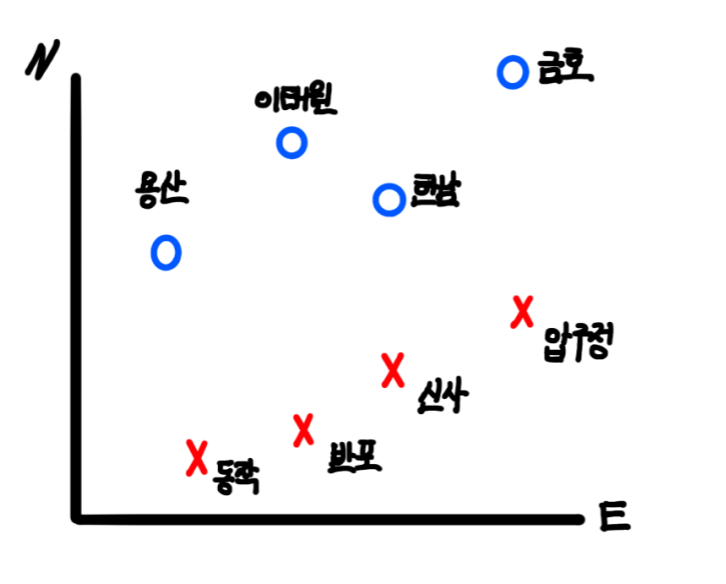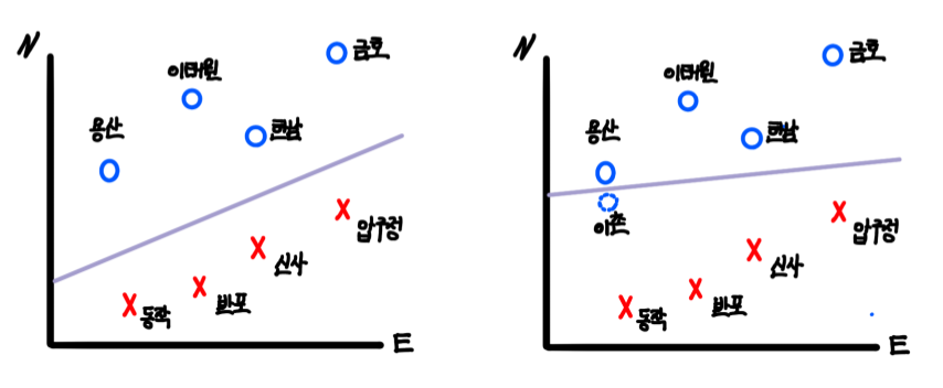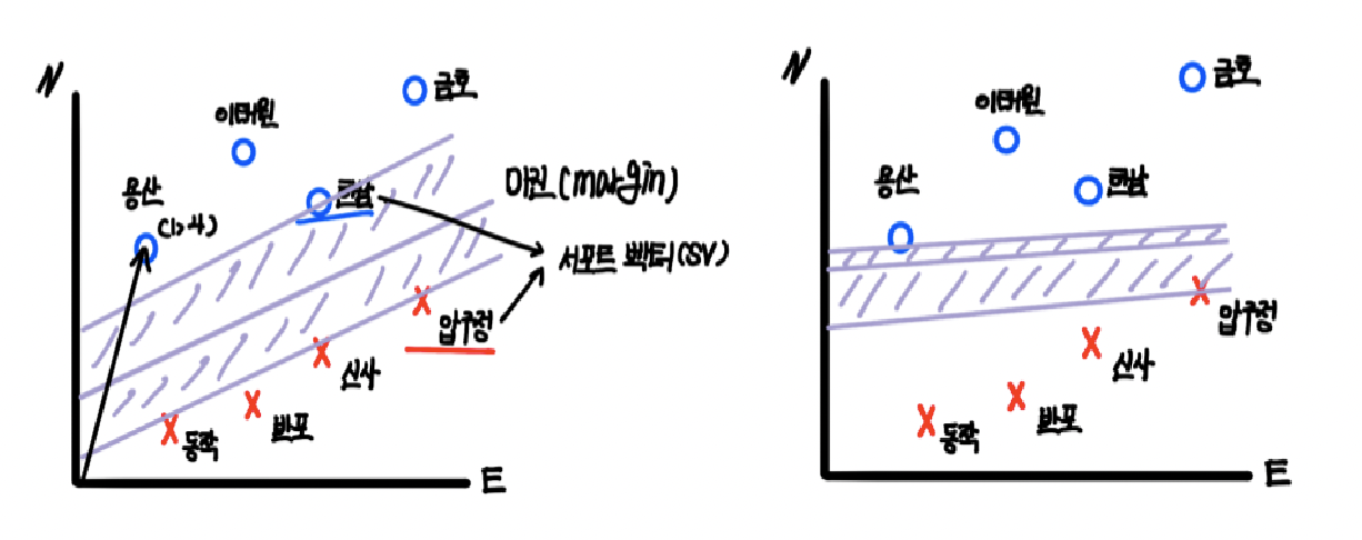 이해를 돕고자 교재의 서울의 어느 지역이 강북인지, 강남인지를 구분하는 예시를 들어 설명하겠습니다. 우리는 현재 서울에서 용산, 이태원, 한남, 금호, 동작, 반포, 신사, 압구정을 여행했습니다. 아래의 그래프는 X, Y축을 동쪽과 북쪽으로 설정한 다음 강북의 용산, 이태원, 한남, 금호를 O, 강남의 동작, 반포, 신사, 압구정을 X로 표현한 그래프입니다. 만약 우리가 강북과 강남을 구분 지을 수 있는 한강의 위치를 2차원 공간의 선으로 표현할 수 있다면, 새로 여행할 성수동이 강북인지, 강남인지 구분할 수 있을 것입니다. 이때 데이터를 구분하는 선, 여기서는 한강을 곧 SVM의 decision boundary(결정 경계)라고 합니다. 단순히 강북과 강남이 구분되기만 하면 되니, 선으로 표현할 수 있는 한강의 후보는 다양합니다. 아래 그림에서 보라색으로 표시된 한강의 위치 후보1의 선과 위치 후보2의 선 둘 모두 강북과 강남을 구분할 수 있으니, 두 후보 선은 SVM 알고리즘의 decision boundary라고 말할 수 있습니다. 하지만 kNN에서 최적의 k를 찾는 것이 중요한 문제였듯이, SVM에서도 최적의 decision boundary를 찾는 것이 중요합니다. 그렇다면 후보 1과 후보 2 중 더 좋은 decision boundary는 어떤 것 일까요? 후보 1은 decision boundary와 강북, 강남의 데이터 중 가장 가까운 데이터 간의 거리가 후보 2에 비해 넓습니다. 후보 2의 decision boundary는 지금의 데이터에서는 가장 잘 학습된 경계선이지만, 용산에서 조금 내려간 이촌을 자칫 강남 지역으로 잘못 예측하는 등 테스트 및 새로운 데이터에 대해서는 정확도가 낮을 수 있습니다. 따라서 후보 1의 decision boundary가 더 좋다고 볼 수 있습니다.