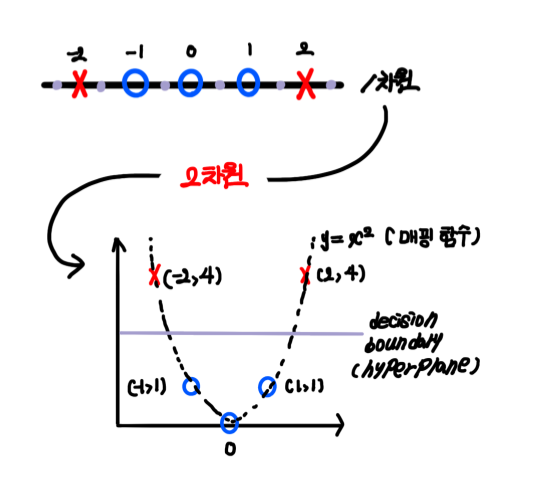 이러한 문제로 인해 SVM에서는 주어진 저차원 벡터 공간의 데이터 벡트들을 고차원 벡터 공간으로 매핑하여 옮긴 다음 decision boundary를 찾는 작업을 진행합니다. 예를 들어, 1차원 선 상의 데이터(x)들을 2차원 데이터로 매핑하면 y축이 생기게 됩니다. y = x^2라는 함수를 통해 1차원 데이터들을 매핑한다면 데이터는 (-2, 4) 등의 2차원 벡터로 표현할 수 있으며, 아래의 그림에서처럼 데이터들을 2차원 좌표계에 그려 적절한한 decision boundary를 찾을 수 있습니다.