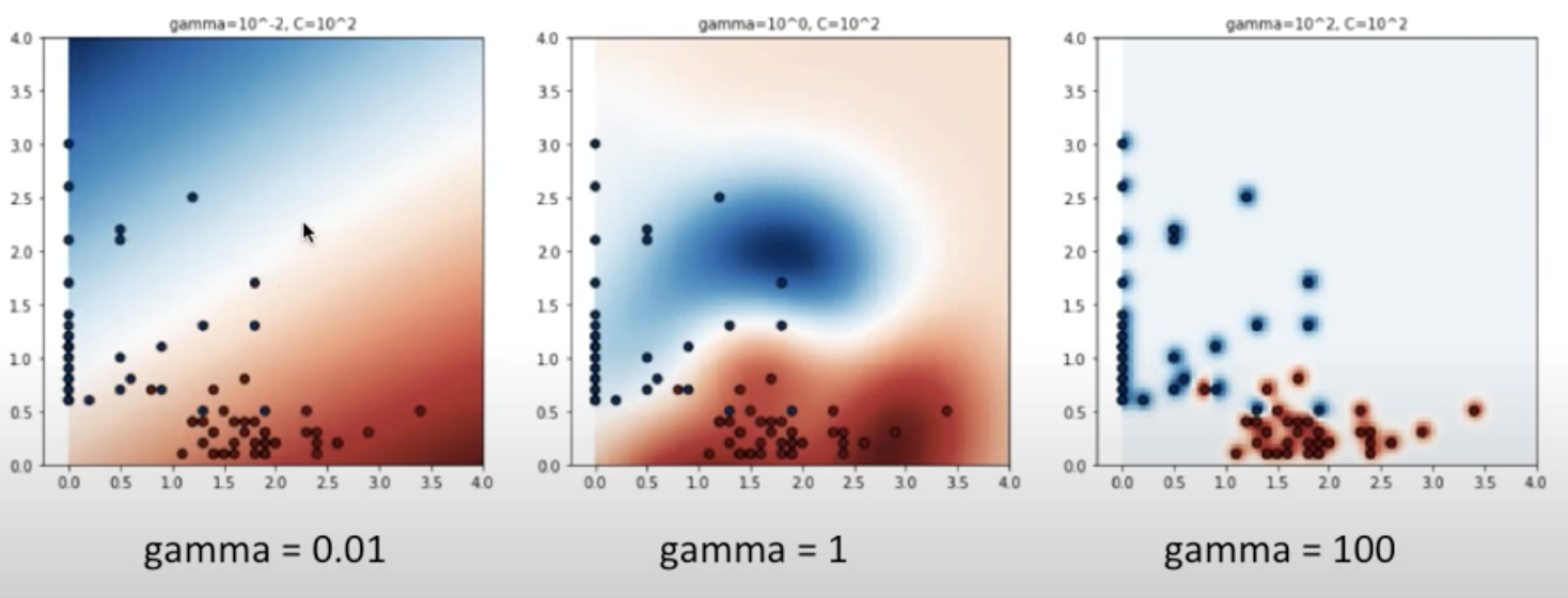 kerenl의 parameter로 위에서 언급한 cost와 gamma를 조절하여 decision boundary의 margin을 조절할 수 있습니다. gamma는 일전에 언급했던 overfitting을 피하고자 Regularization의 cost function에 (lambda)*(∑w^2)를 더해주는 것처럼, kernel에서의 gamma는 데이터 포인트의 영향이 미치는 범위로, decision boundary의 곡률을 조정하는 parameter입니다. gamma가 적을 경우에는 하나 하나의 데이터 포인트가 영향을 끼치는 범위가 넓어지지만, gamma가 높을 경우에는 데이터 포인트가 영향을 끼치는 범위가 좁아집니다. 아래 그림을 보면 gamma = 0.01일 때는 그 범위가 넓어져 파란색 범위와 빨간색 범위가 넓은 범위로 나타나지만, gamma = 100이되면 그 데이터 포인트 바로 주위에만 영향을 끼치게 되어 파란색 범위와 빨간색 범위가 데이터 포인트에 한정적입니다. 따라서 gamma가 커질수록 decision boundary가 학습 데이터에 맞게끔 구부러지는 모습을 보이며, gamma가 작아질수록 decision boudnary가 일반적으로 직선의 모습을 띄게 됩니다. 이는 cost와 마찬가지로 overfitting과 underfitting의 문제를 불러올 수 있으며 따라서 cost와 gamma를 조정하며 overfitting과 underfitting에 대처하여 최적의 decision boundary를 선택하는 것이 중요합니다. 아래의 표는 최적의 cost와 gamma parameter를 찾는 Grid Search의 예시입니다.