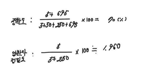 우리는 당연히 이 말이 틀렸다는 것은 알지만, 그 이유에 대해서는 정확히 설명하지 못합니다. 그렇다면 아래의 표를 보겠습니다. 표는 이전 "머신러닝 모델의 성능을 알아보자" 포스트에 있는 암환자를 진단하는 시스템의 예시입니다.