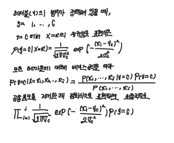 특징이 여러 개인 경우에도 나이브 베이즈 공식은 단순히 하나의 식으로 표현할 수 있습니다. 위의 치킨집 예시를 다시 빌려와 우리는 계산량을 줄이고자 공통분모인 정규화 상수를 제거한 채 계산했습니다. 결과적으로 저녁에 오는 남성 손님은 맥주를 주문할 확률은 0.3, 주문하지 않은 확률은 0.066으로, 저녁에 오는 남성 손님의 특징은 맥주를 주문하는 레이블에 분류될 것입니다. 이때 유의할 것은 저녁이라는 특징과 남성의 특징 서로는 독립적이라는 점입니다. 이제 베이즈 이론과 나이브 베이즈 알고리즘이 어느 정도 이해되었으리라 생각합니다. 서두에서 말했듯이 나이브 베이즈 알고리즘은 스팸 메일 분류에 굉장히 뛰어난 성능을 보입니다. 스팸 메일 분류는 뒤의 실습에서 다시 살펴보기로 하고, 이제는 데이터들의 특징이 이산적이지 않은 경우의 나이브 베이즈 알고리즘을 살펴보겠습니다. 우리가 위에서 살펴본 모든 예시들은 데이터들이 이산적이라는 특징을 가지고 있습니다. 맥주 주문은 O, X로 나뉘며 성별 또한 남성과 여성 두 분류, 시간대는 오전, 점심, 저녁 세 분류로 나누었습니다. 만약 데이터의 특징들이 연속적일 경우에는 어떤 방법을 사용해야 할까요? 이때는 가우시안 나이브 베이즈 분류(Gaussian Naive Bayes)를 사용하는 것이 좋습니다. 가우시안 나이브 베이즈는 특징들의 값들이 정규 분포(가우시안 분포)되어 있다는 가정 하에 조건부 확률을 계산합니다. 정규 분포되어 있다는 가정은 표본 평균과 표본 분산을 가진다는 것을 의미하며 나이브 베이즈 공식과 정규 분포의 표현식을 결합한 형태로 표현합니다. 지금 당장 아래의 수식으로 표현할 수 있지만 당장은 이 수식을 너무 자세히 알 필요는 없을 것 같습니다. 지금 중요한 점은 이산적이지 않은 연속적인 특징들에 대해서는 가우시안 나이브 베이즈 분류를 사용하는 것이 효율적이라는 것입니다. 다음 포스트 실습에서 직접 해볼 것이지만 예시로 붓꽃의 꽃받침 길이에 따른 분류는, 길이라는 연속적인 특징들을 가우시안 나이브 베이즈 분류기로 분류하는 것입니다.