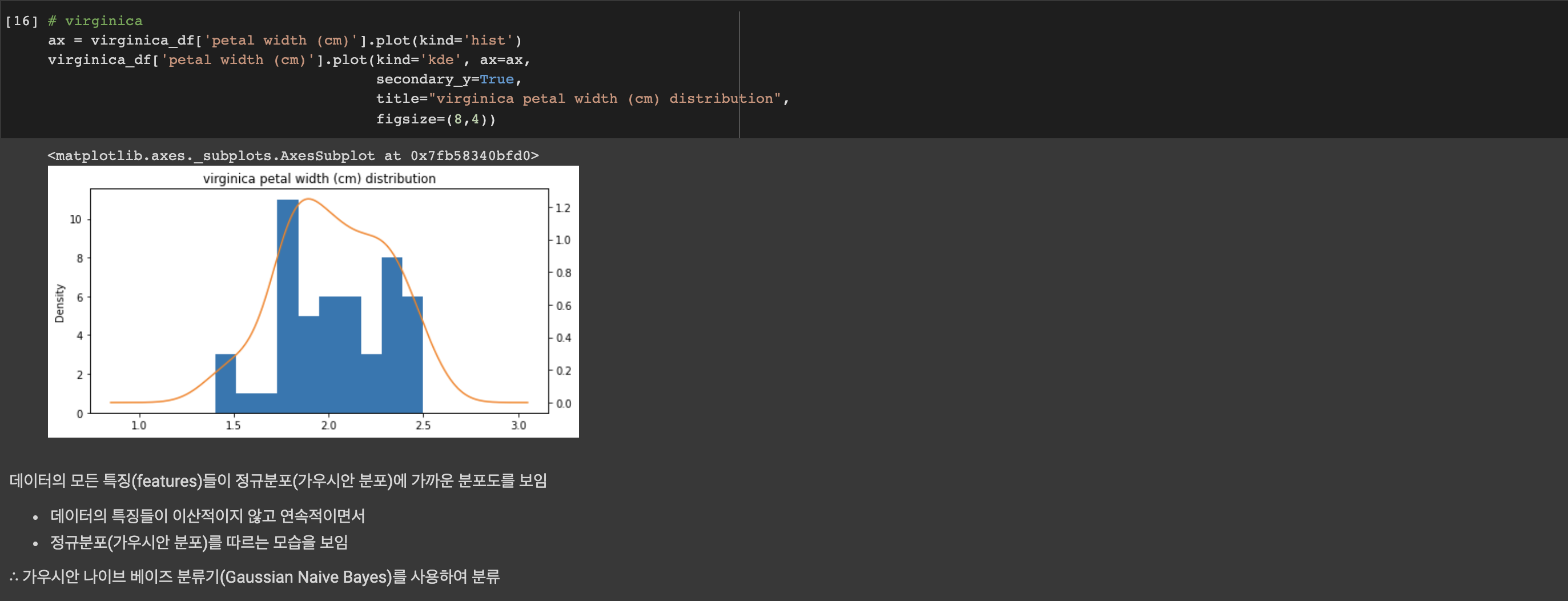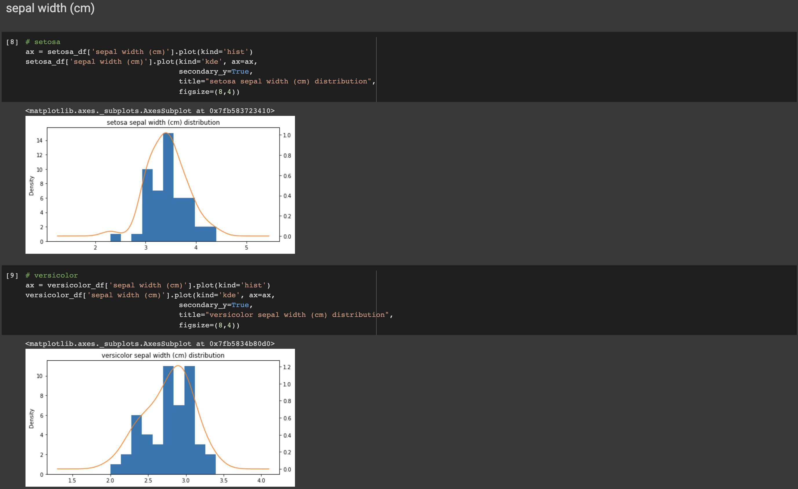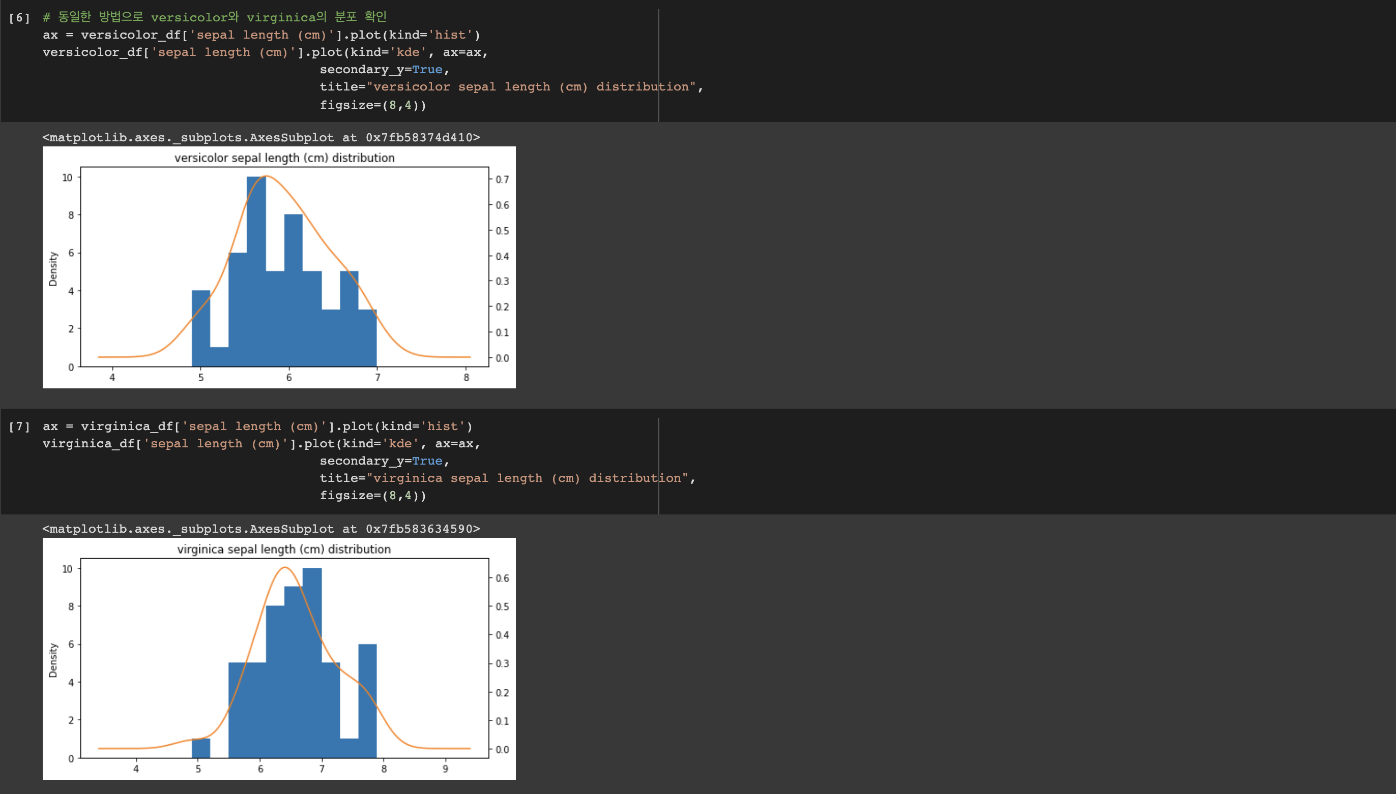 동일한 방법으로 versicolor와 virginica, 그리고 다른 특징들에 대해서도 그래프를 그려 확인해보겠습니다. plot()의 파라미터들을 간단히 짚고 넘어가겠습니다. 먼저 히스토그램 형식의 그래프를 그립니다(plot(kinds='hist')). 그 위에 데이터의 분포를 보기 위해 kde 형식의 그래프를 그리는데 이때 kde는 kernel density estimator, 커널 밀도 추정으로 쉽게는 히스토그램을 스무딩 하는 것을 말합니다. 실제 위의 그래프를 보면 파란색의 히스토그램 그래프와 궤를 같이하는 주황색 곡선을 볼 수 있는데, 이 선이 바로 kde로 그린 선입니다. 데이터의 분포와 밀집도에 의해 그려지는 것을 볼 수 있습니다. ax는 그래프의 축을, seconary_y는 2차 y축을 표시합니다. 리스트나 튜플 형태에서 한 그래프에 레이블을 둘 이상 표시하고 싶을 때, secondary_y를 True로 설정합니다. 디폴트는 False입니다.