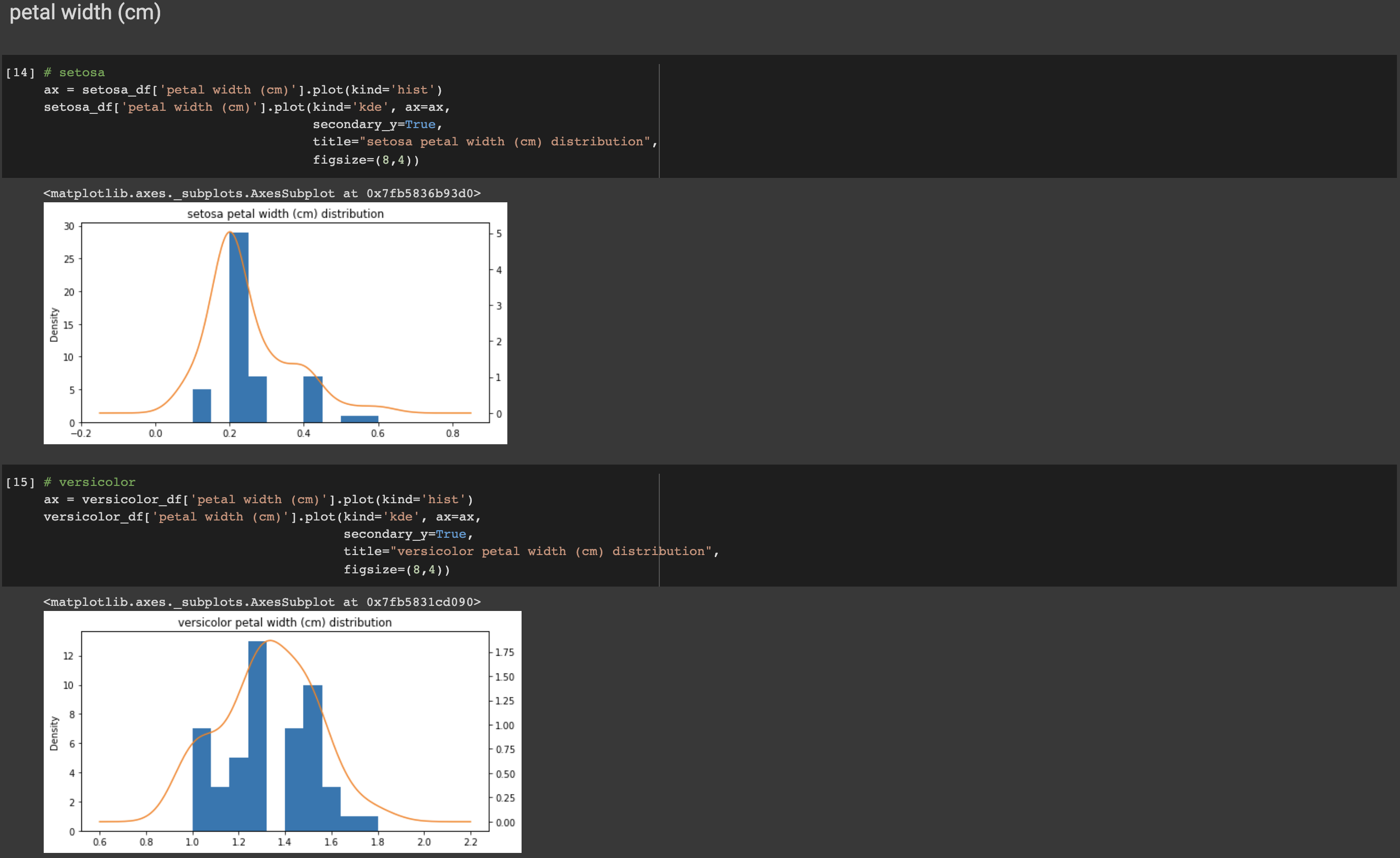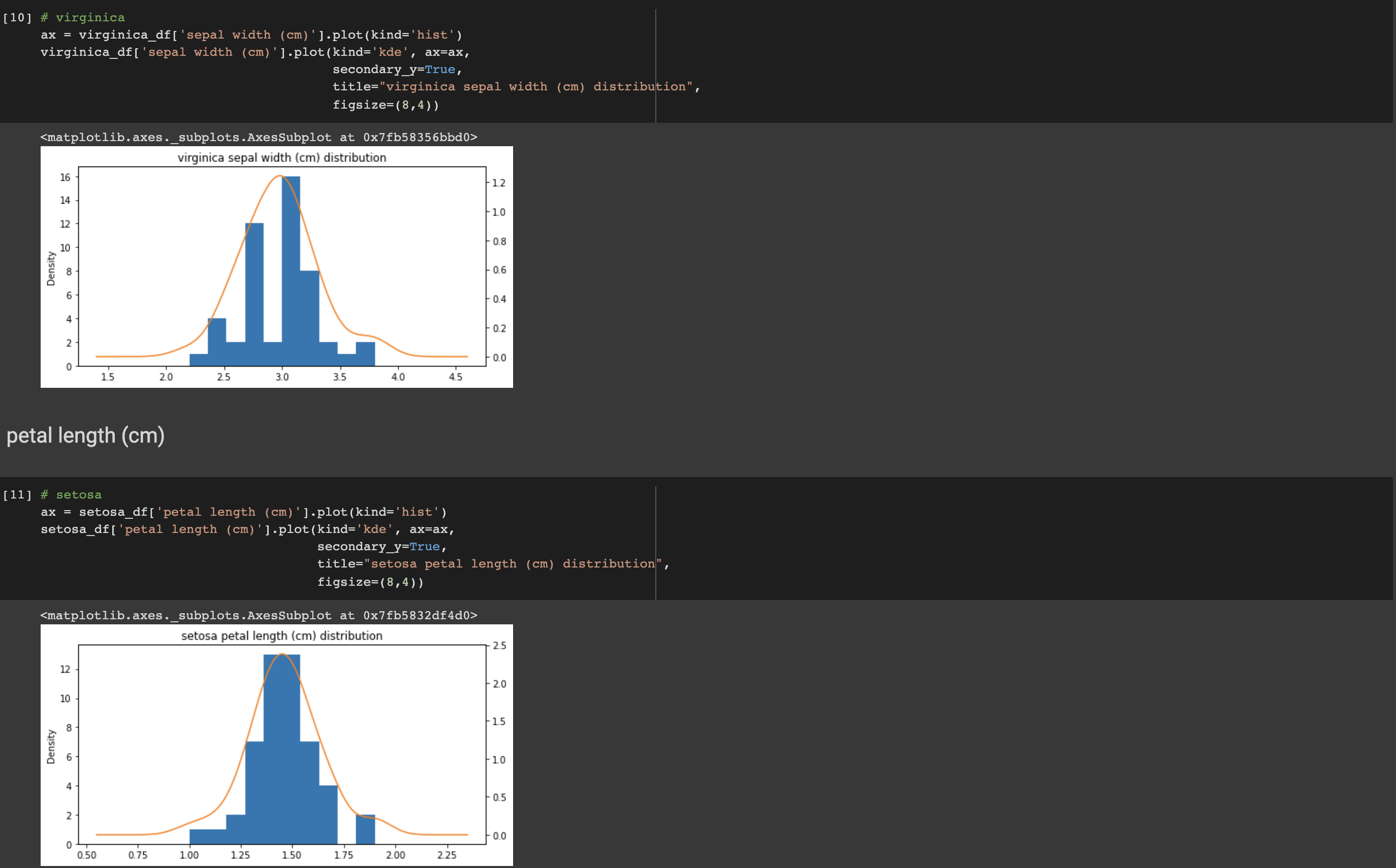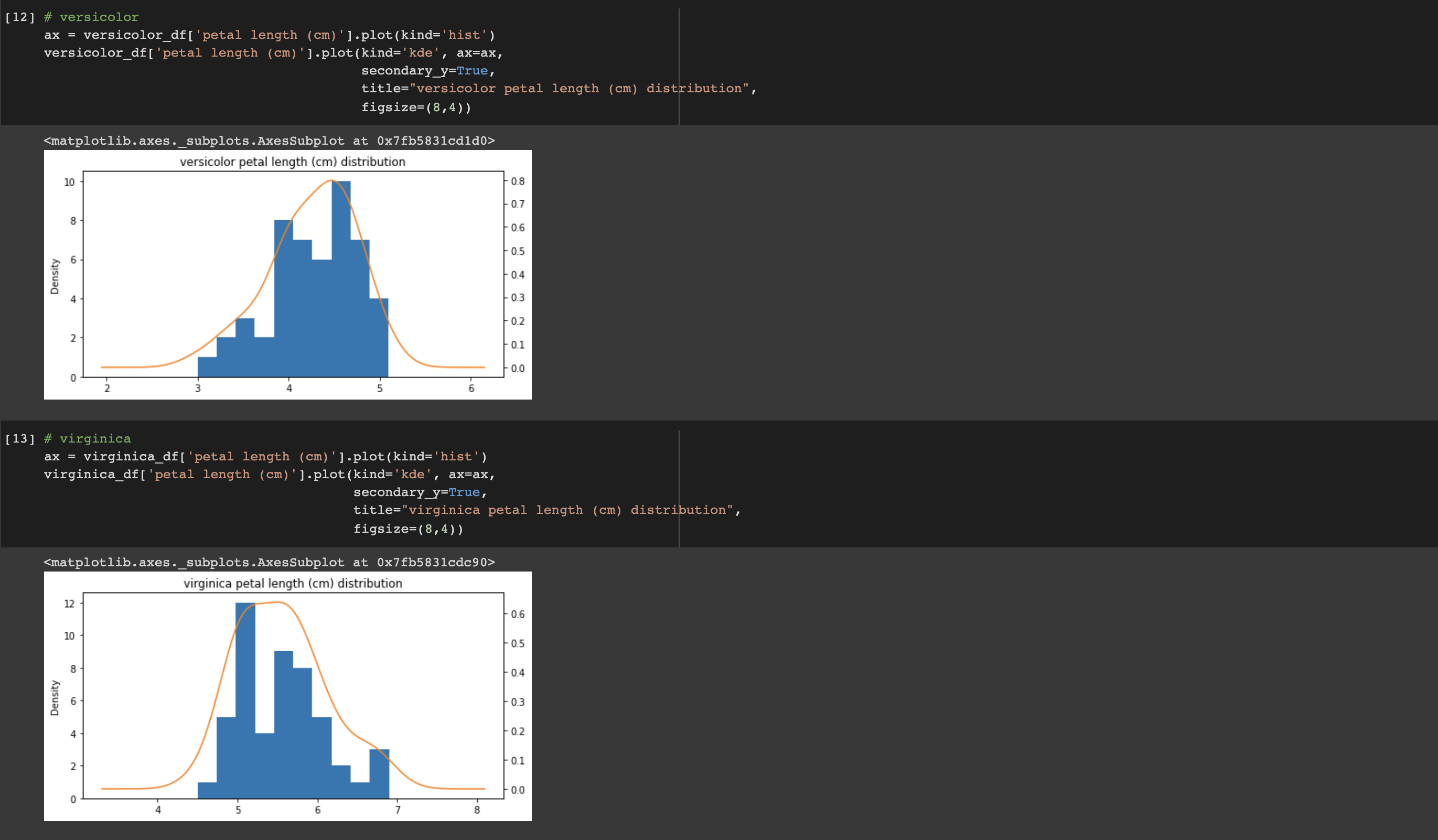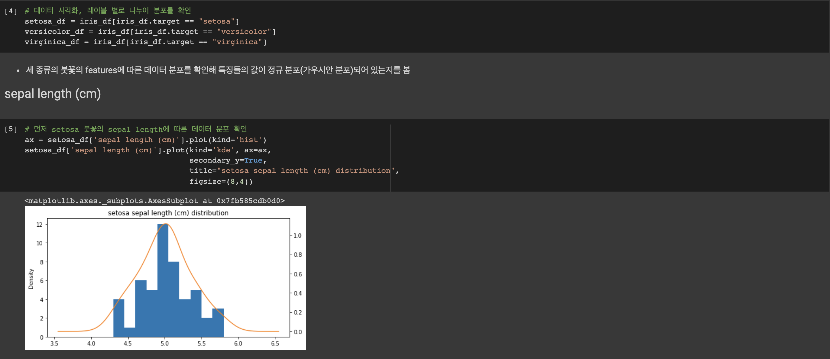 동일한 방법으로 versicolor와 virginica, 그리고 다른 특징들에 대해서도 그래프를 그려 확인해보겠습니다. plot()의 파라미터들을 간단히 짚고 넘어가겠습니다. 먼저 히스토그램 형식의 그래프를 그립니다(plot(kinds='hist')). 그 위에 데이터의 분포를 보기 위해 kde 형식의 그래프를 그리는데 이때 kde는 kernel density estimator, 커널 밀도 추정으로 쉽게는 히스토그램을 스무딩 하는 것을 말합니다. 실제 위의 그래프를 보면 파란색의 히스토그램 그래프와 궤를 같이하는 주황색 곡선을 볼 수 있는데, 이 선이 바로 kde로 그린 선입니다. 데이터의 분포와 밀집도에 의해 그려지는 것을 볼 수 있습니다. ax는 그래프의 축을, seconary_y는 2차 y축을 표시합니다. 리스트나 튜플 형태에서 한 그래프에 레이블을 둘 이상 표시하고 싶을 때, secondary_y를 True로 설정합니다. 디폴트는 False입니다.
