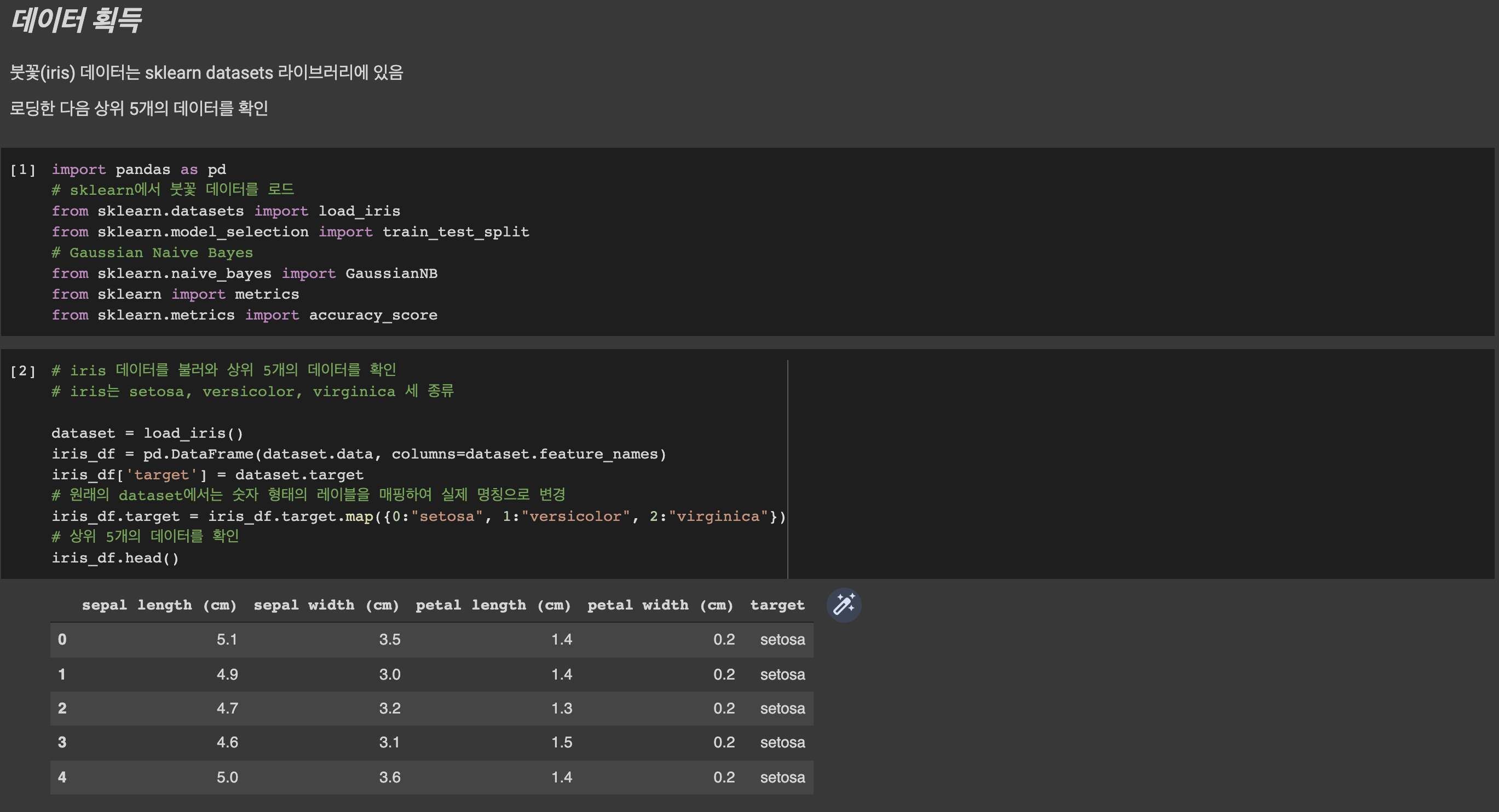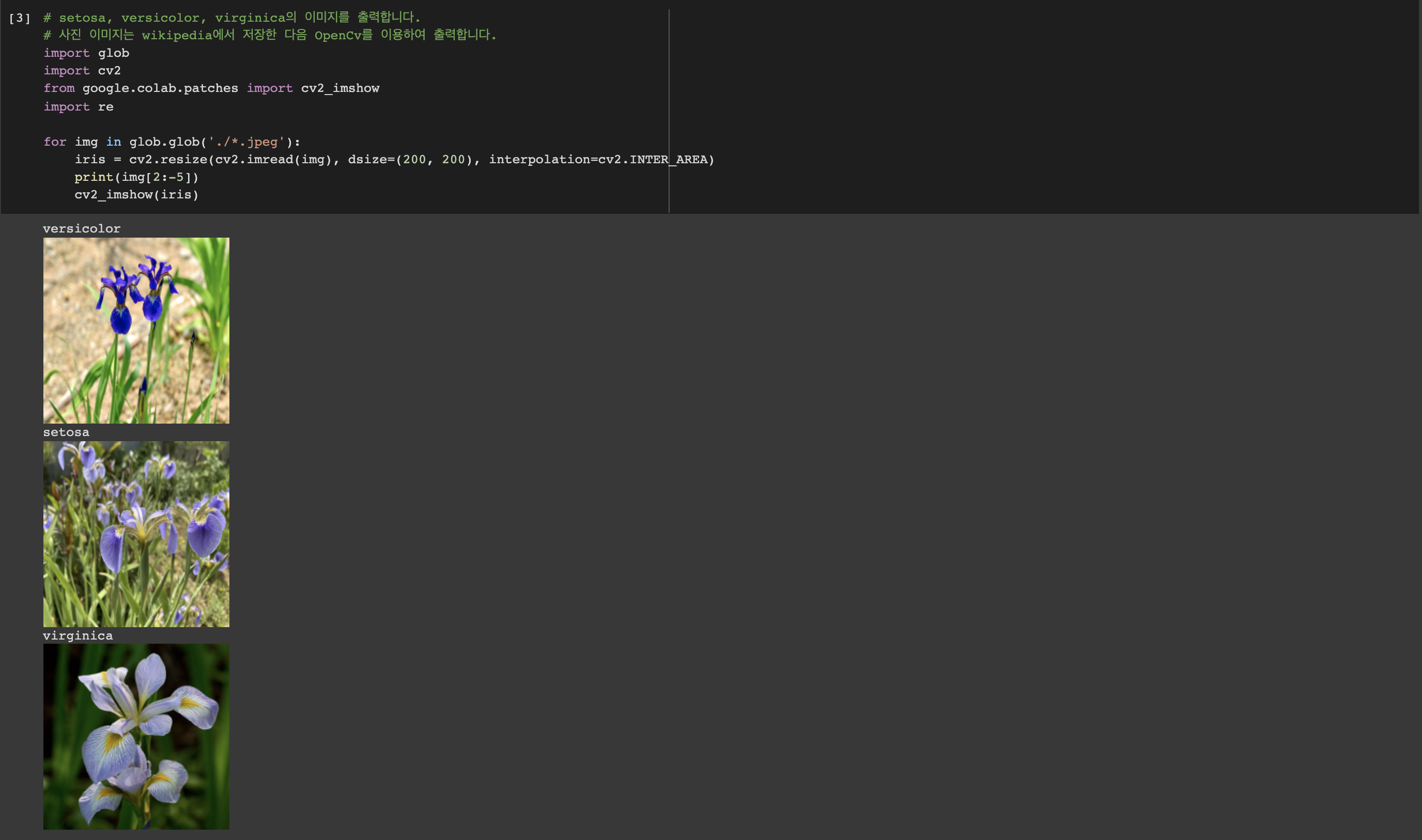 우리는 이미 이전에 kNN, SVM, Decision Tree 실습에서 데이터를 불러와 학습 데이터와 테스트 데이터로 분리한 다음, 학습 데이터를 사용해 모델을 학습하고 테스트 데이터로 모델을 테스트 및 평가, 정확도 측정하는 실습을 많이 해봤습니다. 이번 Gaussian Naive Bayes 모델의 실습 코드도 이전과 별반 다르지 않습니다. 코드 또한 주석만으로도 해석할 수 있듯이 어렵지 않습니다. 붓꽃 꽃받침, 꽃잎의 높이와 너비에 대한 데이터는 sklearn에 이미 저장되어 있습니다. 따라서 로드하여 데이터를 부른 다음 상위 5개의 데이터를 확인합니다. 이때, 붓꽃(iris)의 종류(label)는 총 3가지로, setosa, versicolor, virginica가 있습니다. 하지만 원래의 데이터에는 이들이 0, 1, 2로 구분되어있으므로, 숫자로 되어있는 레이블을 실제 명칭에 매핑해줍니다. 현재까지 문제를 정의하고 데이터를 획득했으며 획득한 데이터를 사용하기 좋은 형태로 전처리했습니다. 이제 데이터를 시각화해보겠습니다. 데이터를 시각화하는 작업은 표나 그래프로 나타냈을 때 데이터의 특징 및 필요/불필요한 데이터를 알려주는 역할, 적절한 모델 선택 등 다양한 이점이 있습니다. 이번에는 붓꽃의 세 종류를 다시 데이터 프레임 형태로 만들어 각각 sepal length / width(꽃받침 높이 / 너비), petal length / width(꽃잎 높이 / 너비)의 데이터 분포를 확인해보겠습니다. 세 종류의 네 특징, 총 12개의 그래프가 그려지겠습니다. 잠시, 이전에 붓꽃이 어떻게 생겼는지 종류별로 직접 보고 가는 것도 좋을 것 같습니다. 코랩에서는 새 윈도우창을 띄워 사진을 보여주는 cv2.imshow()는 되지 않기 때문에 코랩에서 바로 출력하는 cv2_imshow()를 사용합니다. 사진 또한 깃허브의 data 디렉토리에 있으므로, 필요하시다면 다운로드하여 사용하시면 됩니다. 이 코드에 대한 설명은 추후 OpenCv()를 다룰 때 glob()와 한 번에 설명하겠습니다.