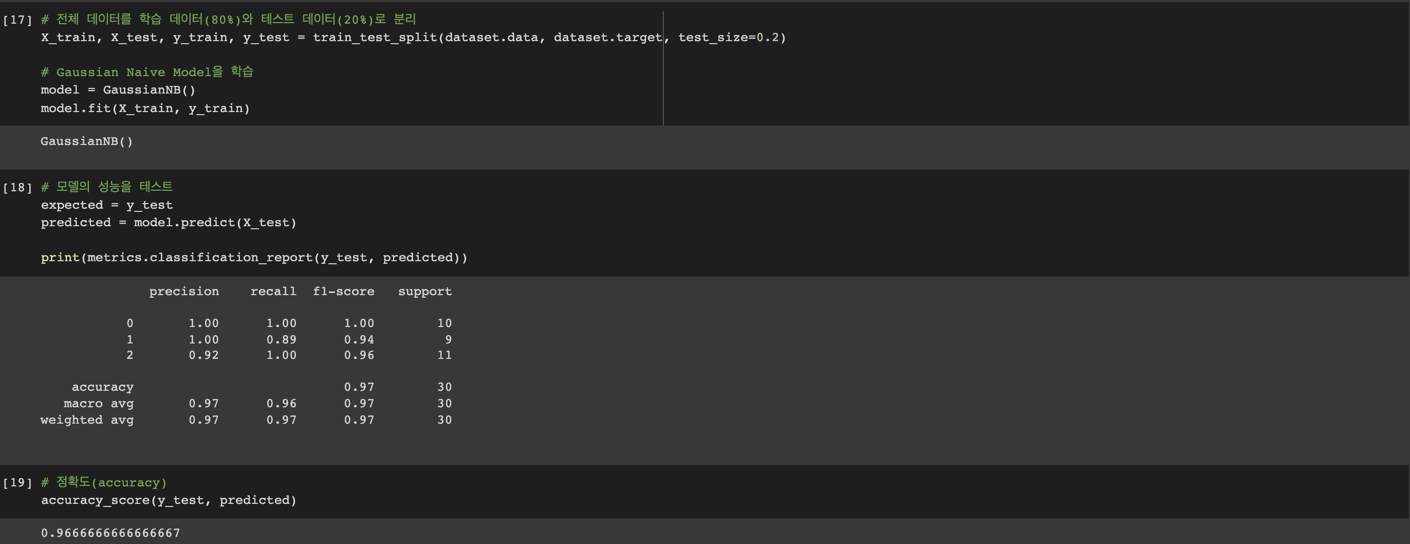 세 종류의 붓꽃과 네 가지 특징을 모두 조합해 그래프를 모두 그려봤습니다. 이번 그래프 시각화에서 필요한 정보를 추출해보겠습니다. 주황색의 kde 형식의 그래프를 보면 12가지의 모든 그래프들이 가우시안 분포를 가깝게 따르고 있음을 알 수 있습니다. 이 점이 중요한데, 우리는 이때까지 모델을 설정한 다음 데이터를 시각화하고 데이터를 다듬었지만, 실제에서는 Raw 데이터를 시각화한 다음, 가우시안 분포를 따르고 있음을 바탕으로 가우시안 나이브 베이즈 분류기를 사용하는 것이 적절함을 추론하는 것이 중요합니다. 이제 전체 데이터를 테스트 데이터와 학습 데이터로 나눈 다음 모델을 학습하고 성능을 테스트해보겠습니다. 이 과정은 이전의 실습 포스트들에서 여러 번 다뤘기 때문에 더 자세히 다루지는 않겠습니다. 그렇다면 바로 다음 포스트로 넘어가 스팸 메일 분류 나이브 베이즈 모델을 보겠습니다. 나이브 베이즈 알고리즘은 문서 및 스팸 메일 분류 등 문서 분류에 굉장히 높은 정확도 및 실제에서도 많이 사용되고 있습니다. 이번 포스트를 읽어주셔 감사합니다.