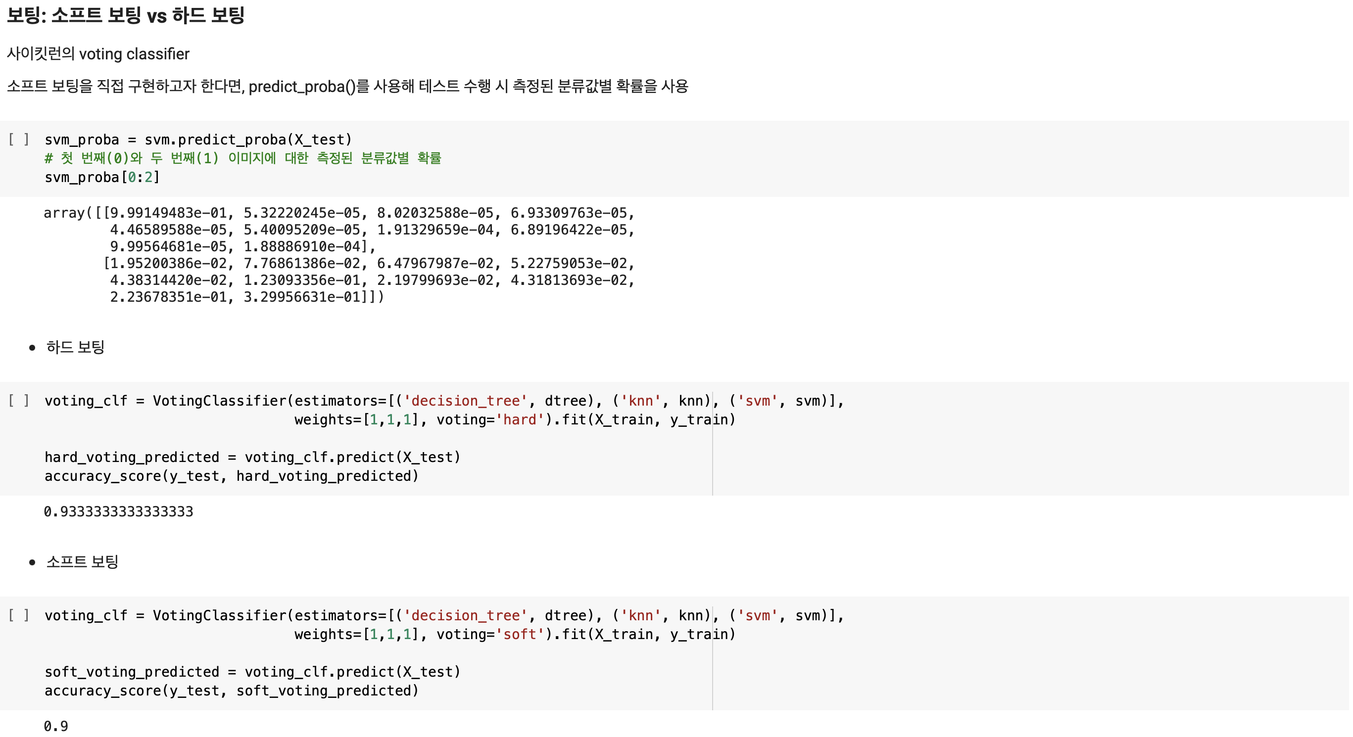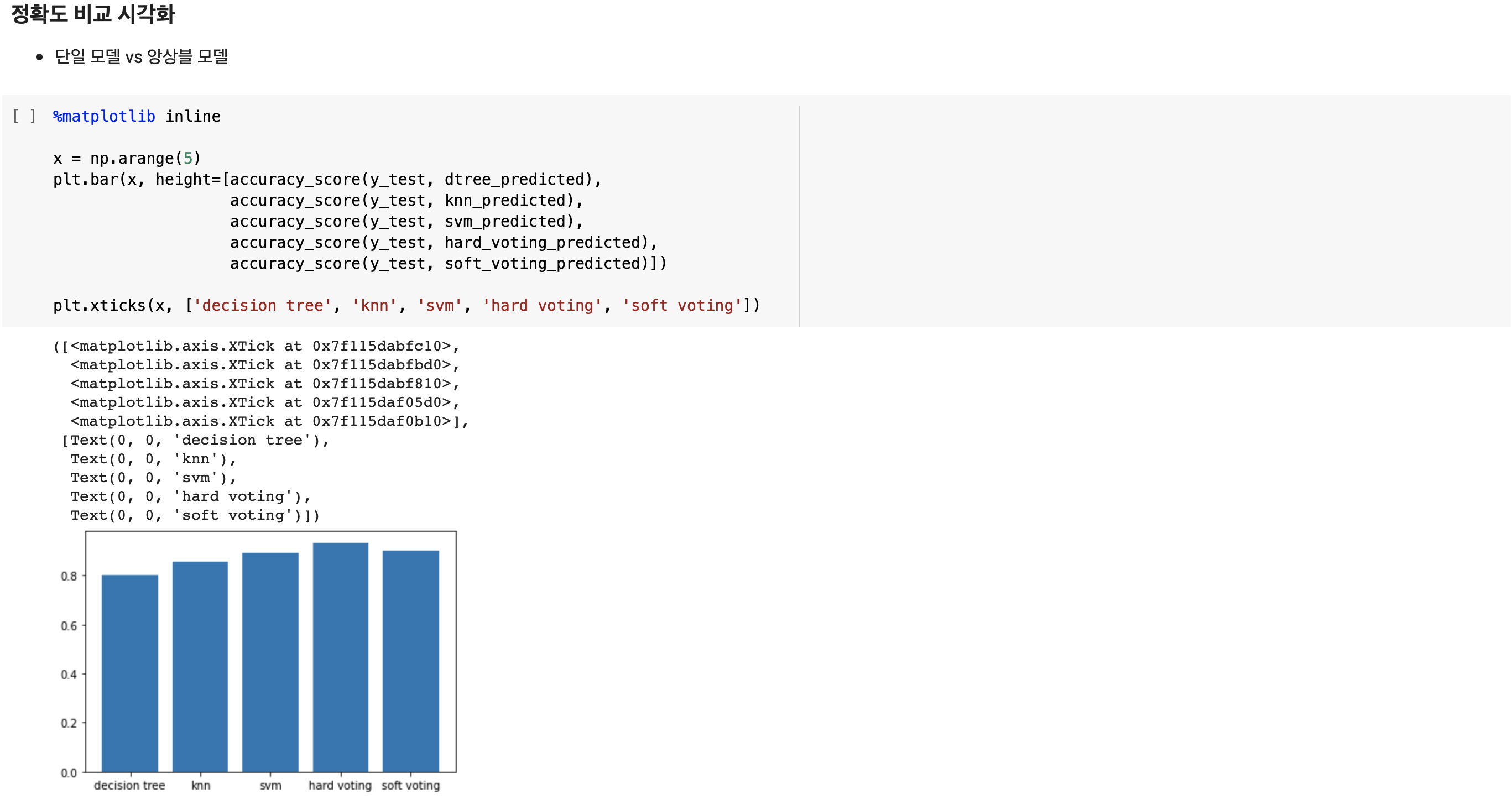 하드 보팅의 정확도가 가장 높았으며 다음으로 소프트 보팅과 SVM, kNN 순으로 정확도가 높으며 Decision Tree의 정확도가 0.8로 가장 낮습니다.