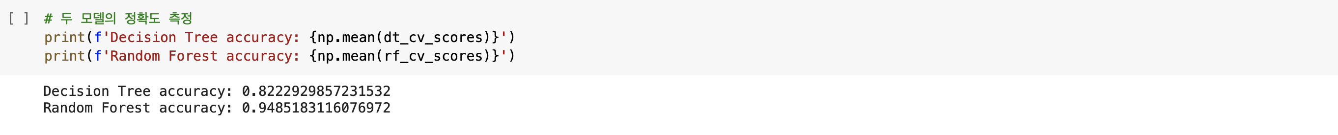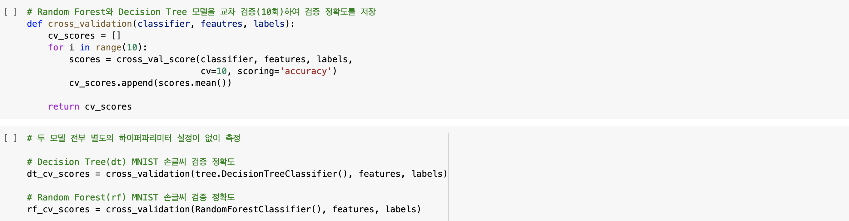 이제 두 모델을 학습한 다음 이를 교차 검증할 함수를 만들겠습니다. 교차 검증 함수인 cross_validation()에서는 10회의 교차 검증을 통해(cv=10), 모델의 정확도를 측정한 평균값을 반환합니다. Decision Tree와 Random Forest 모델은 사이킷런에 구현되어 있으므로 별도의 하이퍼파라미터를 설정하지 않고 모델을 학습하여 교차 검증을 진행하겠습니다. 별도의 하이퍼파라미터를 설정하지 않은 이유는 Decision Tree의 과적합을 놔둔 채, 이를 보완하여 나온 Random Forest 모델과의 정확도 차이를 더욱 확연하게 보기 위함입니다.