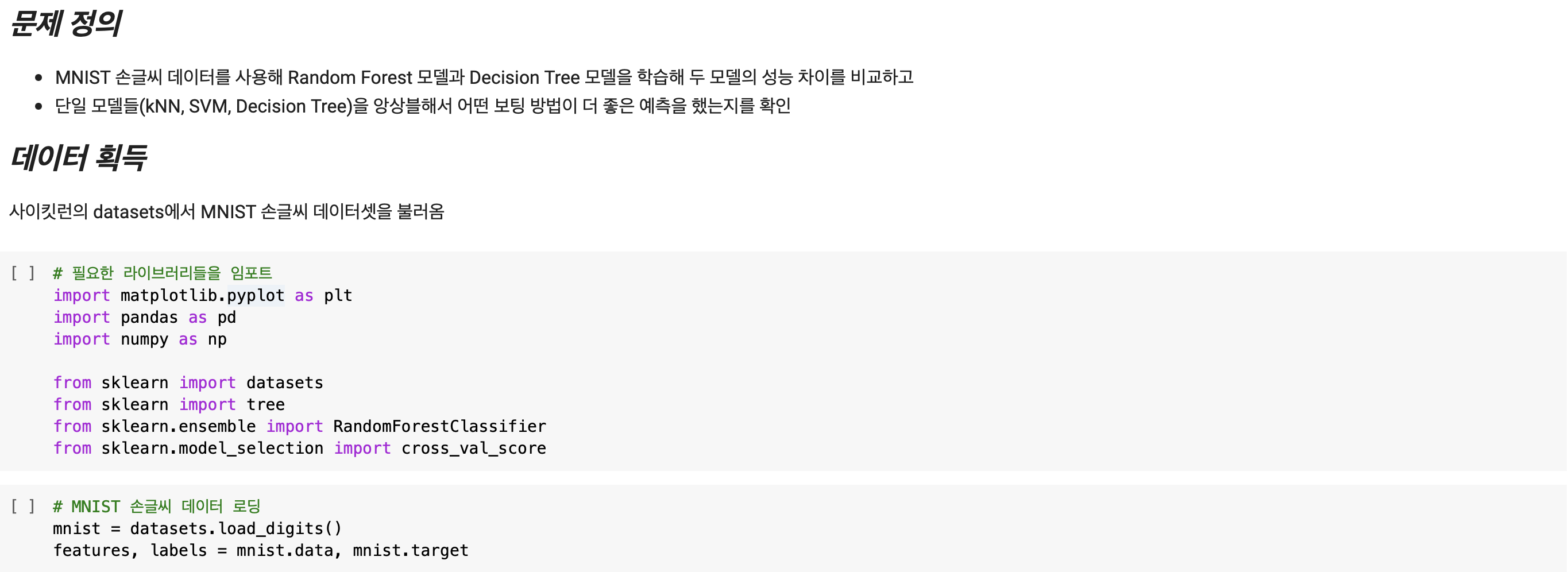 이번 포스트에서는 MNIST 손글씨 데이터셋을 랜덤 포레스트 모델로 학습해보고, 동시에 의사결정 트리 모델을 학습하여 두 모델의 성능 차이를 시각화하여 비교해 보겠습니다. 추가로 이때까지 배운 kNN, SVM, Decision Tree 모델들을 앙상블 하여 보팅 하는 어그리게이팅 과정을 거쳐 더 좋은 예측 모델을 생성해보는 실습까지 진행해보겠습니다. 먼저 이전 포스트에서 살펴봤으나 다시 한번 랜덤 포레스트 모델에 대해 한 줄로 요약하자면 앙상블 기법을 사용하여 여러 의사결정 트리를 배깅하여 예측하는 모델입니다. 하나의 의사결정 트리로 데이터를 학습했을 시에는 과적합의 위험성이 매우 높으며 따라서 이를 보완한 랜덤 포레스트 모델이 학습 시 더 높은 정확도를 보일 것임을 예측하며 다음의 실습 과정을 보겠습니다.