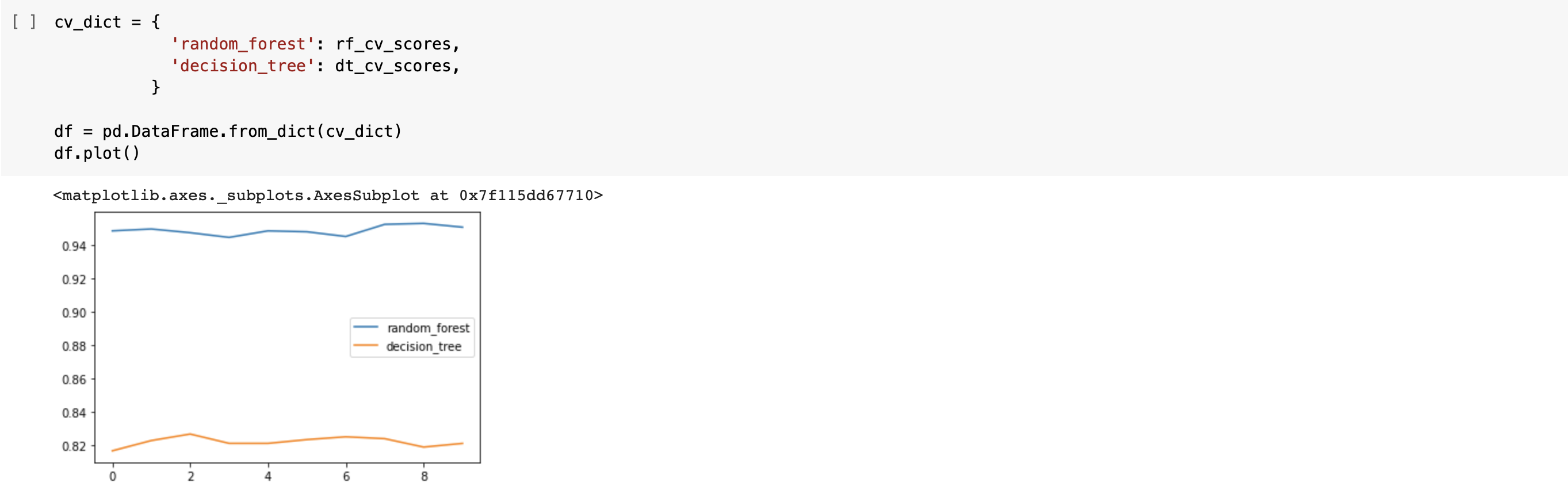 이제 측정된 두 모델의 정확도를 판다스 형태로 시각화하겠습니다. cross_validation()에서 반환된 리스트를 담은 cv_list를 딕셔너리로 저장해 판다스의 데이터 프레임 형태로 만들어준 다음 plot()을 통해 그려보면 아래의 그래프를 볼 수 있습니다. 시각화하여 그래프를 그려보니, 두 모델의 확연한 성능 차이를 확인할 수 있습니다. 검증 횟수에 상관없이 모든 검증에서 Random Forest 모델이 Decision Tree 모델에 비해 정확도가 높았으며, Decision Tree 모델의 정확도가 다소 낮은 이유는 처음에 언급했듯 과적합이 원인임을 짐작해볼 수 있습니다. 실제로 정확도를 보면 Decision Tree는 0.822... 인 반면 Random Forest 모델은 0.948... 의 높은 정확도를 보이고 있습니다.