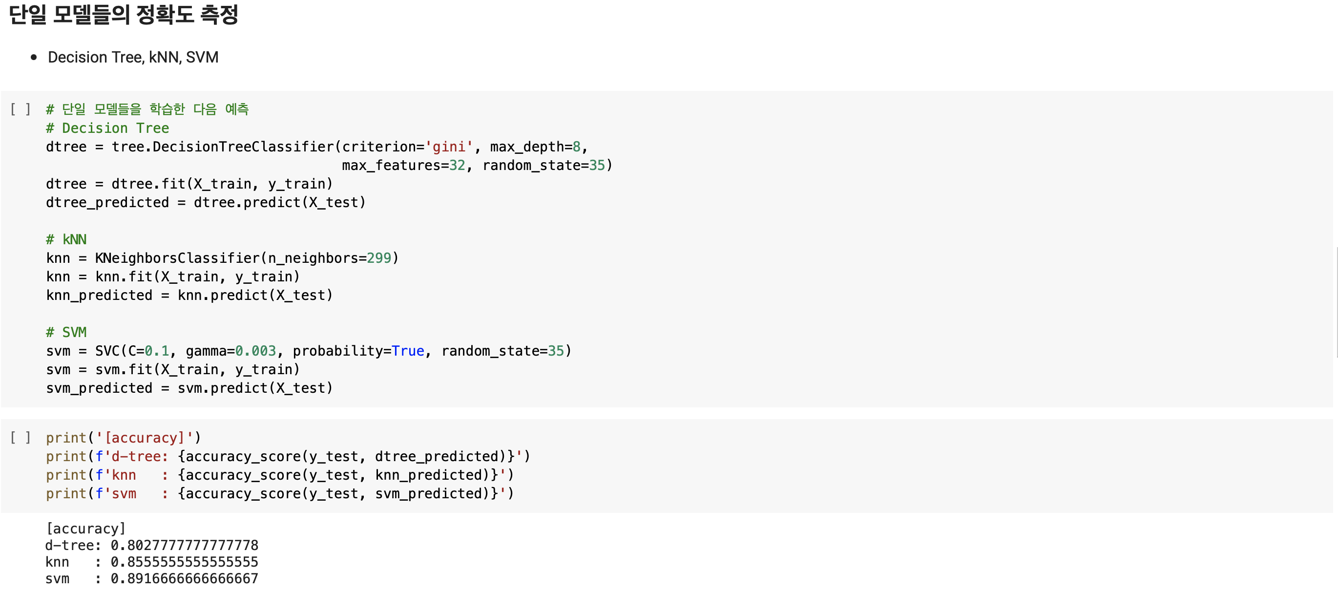 그렇다면 바로 다음으로 넘어가 보팅 앙상블 기법을 사용한 MNIST 손글씨 분류 실습을 해보겠습니다. MNIST 데이터셋은 위에서 이미 로딩해두었으므로 이번에는 앙상블 할 모델들(kNN, SVM, Decision Tree)을 임포트한 다음 이번에는 MNIST 데이터를 학습 데이터와 테스트 데이터로 분리하겠습니다. 이번 실습에서 살펴볼 점은 단일로 학습된 모델에 비해 앙상블한 모델의 예측 정확도가 더 향상되었는지를 살펴보는 것이 우선이므로, 먼저 단일 모델의 정확도를 측정해보겠습니다. 대신 이번에는 의사결정 트리를 학습 시 max_depth, max_features 등의 하이퍼파라미터를 설정해 과적합을 방지하고자 했으며, 모델들을 학습하고 예측하는 과정은 model.fit()과 model.predict()로 쉽게 구현할 수 있습니다.