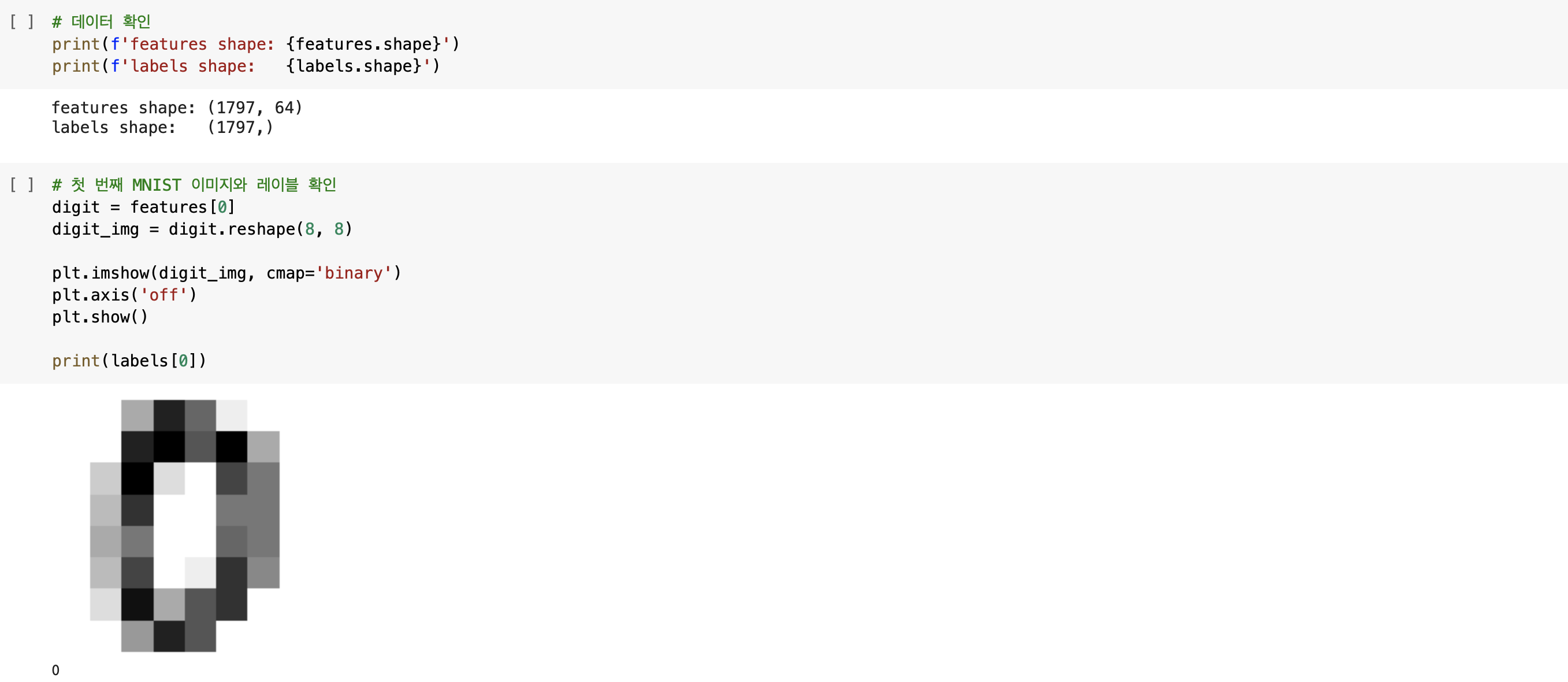 그렇다면 이번 실습에 사용할 MNIST 데이터 셋의 데이터 형태와 첫 번째 이미지 및 레이블을 직접 확인해보겠습니다. 첫 번째 이미지를 보면 다소 흐릿하지만 0임을 확인할 수 있으며 레이블 또한 0입니다. 이보다 중요한 점은 digit를 digit_img로 reshape 하는 과정인데, 원래의 MNIST 데이터셋에서는 이미지를 확인하기 위해 1차원으로 펴진 데이터를 2차원으로 표현하기 위해 reshape(28, 28)로 작성해야 하지만, 이번 MNIST 데이터셋의 이미지는 8x8로, 64개의 열을 가진 1차원 데이터로 펴져있기 때문에 복원할 때는 reshape(8, 8)로 작성해야 합니다. 바로 이러한 점을 확인하기 위해 바로 위에서 데이터 형태를 확인했으며, features shape: (1797, 64)에서 8x8의 이미지 크기임을 눈치채는 것이 앞으로의 코드 작성에 도움 될 것입니다.