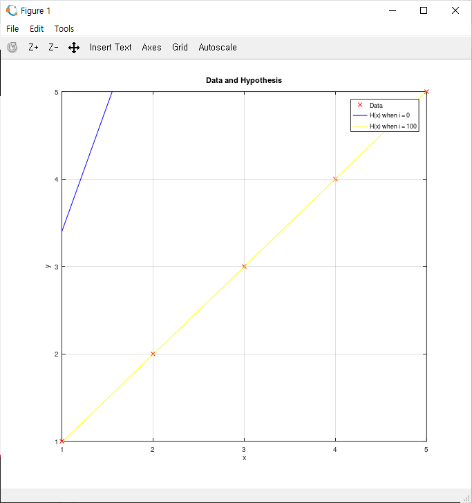 6.2. 출력값을 보면 W는 2.45에서 1.00으로 점차 1에, b는 0.37에서 -0.01로 점차 0에, cost는 45.6에서 0.00으로 0에 수렴하는 것을 알 수 있습니다. 이 데이터들로 그래프 1.2. 에 추가해 i = 100일 때의 그래프를 그려보면 H(x)가 Training set에 가까워진 것을 확인할 수 있습니다.