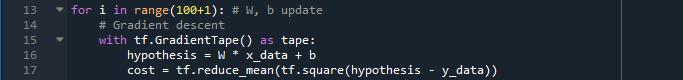 3.1. 일반적으로 텐서플로우에서 Gradient descent 알고리즘은 GradientTape()을 이용하여 구현합니다. GradientTape()은 with블록 내 변수들(W, b)의 변화를 tape에 저장하며, 이후 우리는 tape.gradient() 메서드를 호출해 변수들의 미분 값을 구하여 변수를 업데이트할 수 있습니다.