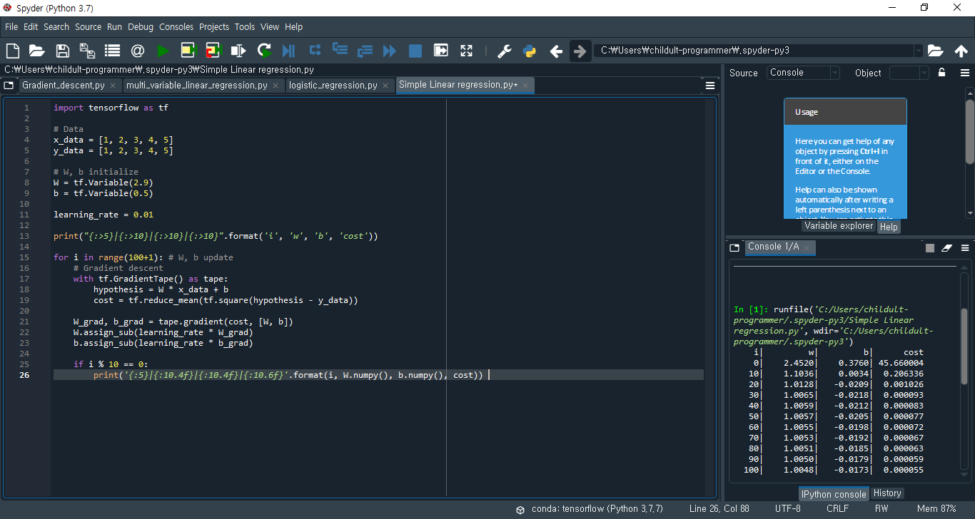 아래의 코드는 Spyder(tensorflow)에서 작성되었습니다. Anaconda Prompt에서 tensorflow를 설치했다면 Anaconda Navigator에서 tensorflow Spyder을 다운로드하실 수 있습니다.