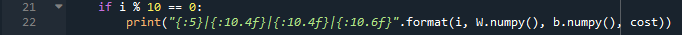 6.1. W, b, cost 값의 변화의 추이를 보기 위해 if문을 사용해 i가 10의 배수일때 값을 출력하도록 했습니다.