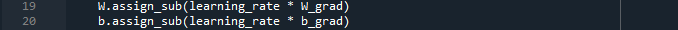 5.1. W.assign_sub(Args) 메서드는 파이썬의 W -= Args와 같은 개념으로, 인자를 뺀 값을 다시 할당해주는 역할을 합니다. 따라서 이 메서드를 사용해서 우리는 W, b에서 이전에 구한 W_grad, b_grad에 learning_rate를 곱한 값을 빼서 W와 b에 할당해주는 과정을 통해 W와 b를 업데이트해줍니다. (W -= W.grad * learning_rate, b -= b.grad * learning_rate)