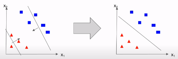 로지스틱 회귀에서는 데이터를 분류해주는 적절한 Hypothesis가 필요합니다. 왼쪽의 두 직선은 데이터를 잘 분류하지는 못하는 것으로 보이는 반면 오른쪽의 직선은 데이터 ■과 ▲을 분류해주는 적절한 직선입니다. 따라서 Hypothesis가 오른쪽 직선일 때 cost가 0이므로 우리는 로지스틱 회귀에서 오른쪽 직선과 왼쪽 직선의 차이로 cost function을 표현할 수 있습니다.
